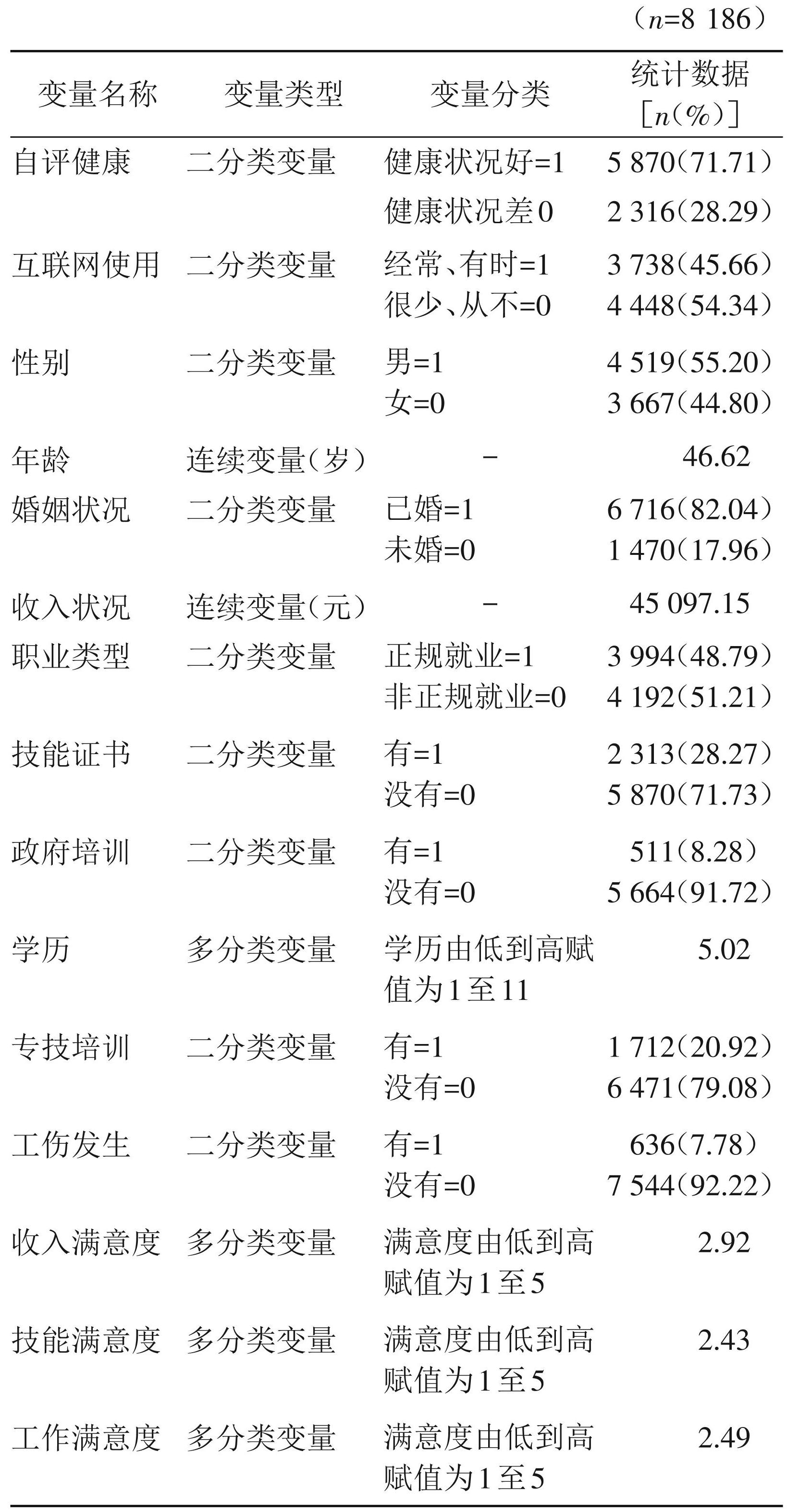 本文数据源自中国劳动力动态调查 2016 年、 2018年共两期数据,研究对象为城乡融合过程中以经济因素为主要驱动力的流动人口[2]。为更清晰地反映互联网使用对流动人口健康水平的作用并探讨其职业发展能力提升的中介效应,在数据处理中筛选出流动人口中年龄16~64岁,处于就业状态的劳动年龄人口样本[25],剔除异常值、缺失值和无效回答,共获得8 186个样本观测数据。