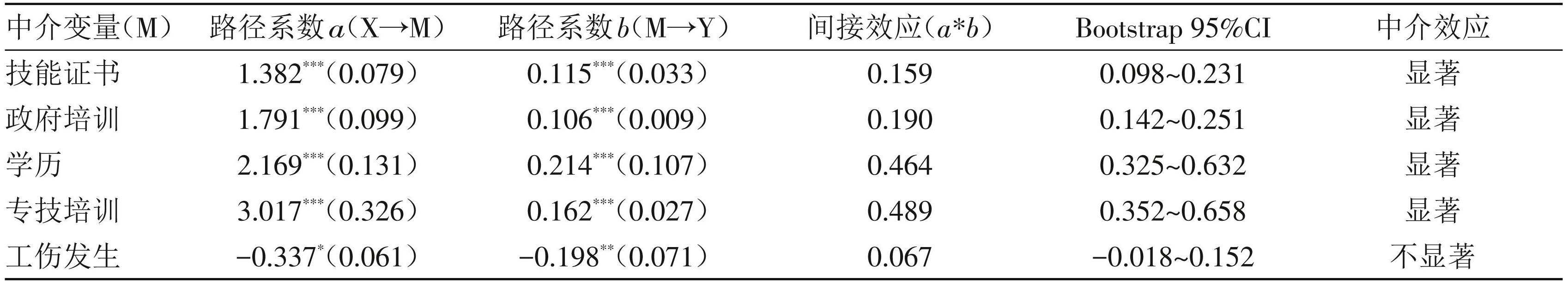 为检验互联网使用(X)是否通过提升职业发展能力(M1)和就业满意度(人岗匹配)(M2)进而改善流动人口健康状况(Y),本文构建中介效应模型,采用系数乘积法,并使用 Bootstrap 重复抽样 5 000 次以获得中介效应的标准误区间,若Bootstrap 95%置信区间(95%CI)不包含0,则表明中介效应存在。