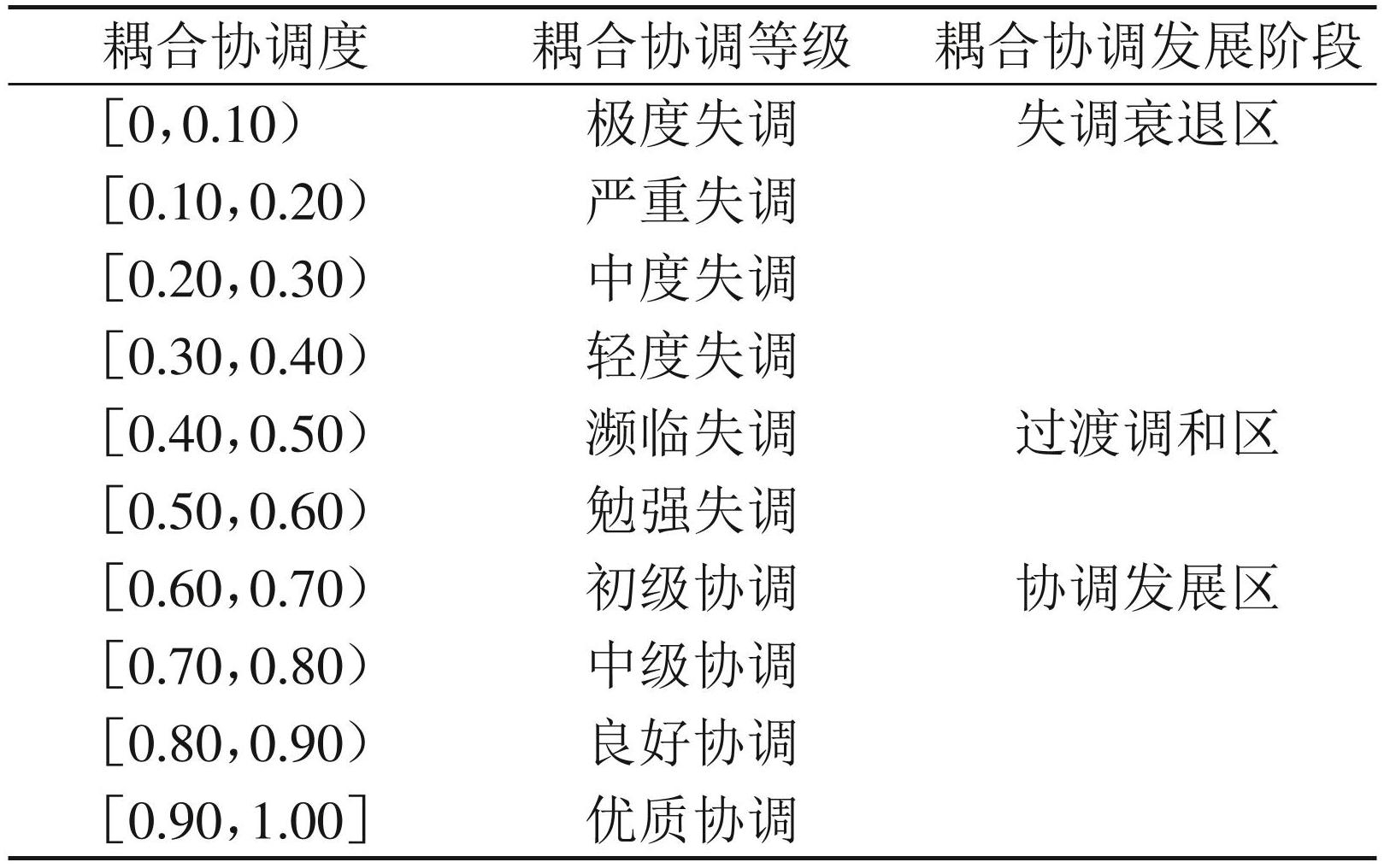 耦合协调度等级划分。借鉴丁仕潮等[15] 的研究,将中医药服务与养老服务的耦合协调度划分为 10个等级,详见表2。