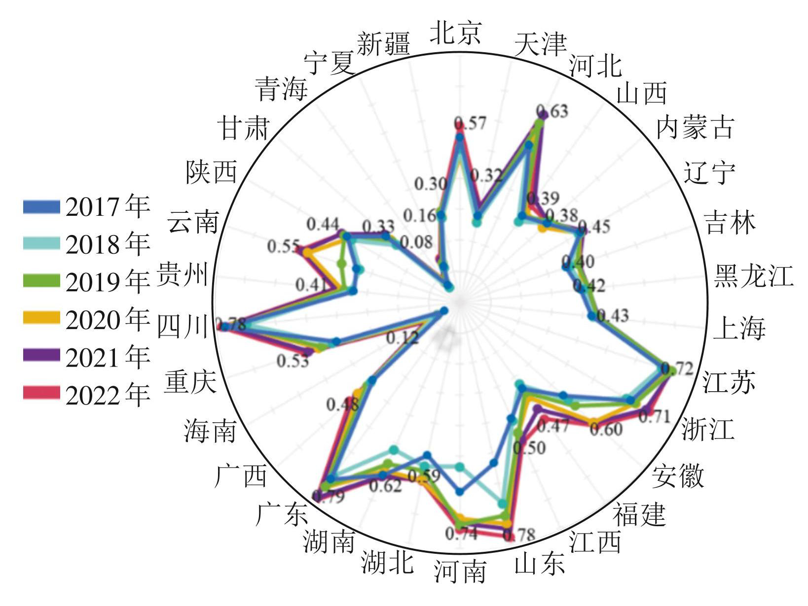 从省域层面看,四川、广东、江苏、山东、河南、浙江、河北等处于协调发展区;新疆、天津、宁夏、海南、青海等处于失调衰退区,其余均处于过渡调和区。具体而言,2017年,四川、广东、江苏等为中级协调,浙江、河南、湖南等为初级协调,河北、山东、 A 北京、湖北等为勉强协调,安徽、辽宁、上海、陕西、重庆、江西等为濒临失调,黑龙江、内蒙古、广西、吉林、云南、福建、山西、贵州、甘肃等为轻度失调,新疆、天津等为中度失调,宁夏、青海、海南等为极度或严重失调。其中,四川(0.77)最高,海南(0.06)最低。2022年,广东、山东、四川、河南、江苏、浙江等为中级协调,河北、湖南等为初级协调,安徽、湖北、北京、云南、重庆等为勉强协调,江西、广西、福建、辽宁、陕西、上海、黑龙江、贵州、吉林等为濒临失调,山西、内蒙古、甘肃、天津、新疆等为轻度失调,宁夏、海南等为严重失调,青海为极度失调。其中,广东最高(0.79),青海(0.08)最低。说明我国中医药服务与养老服务的耦合协调水平地区间差异缩小,但高耦合协调水平的省份仍然较少。