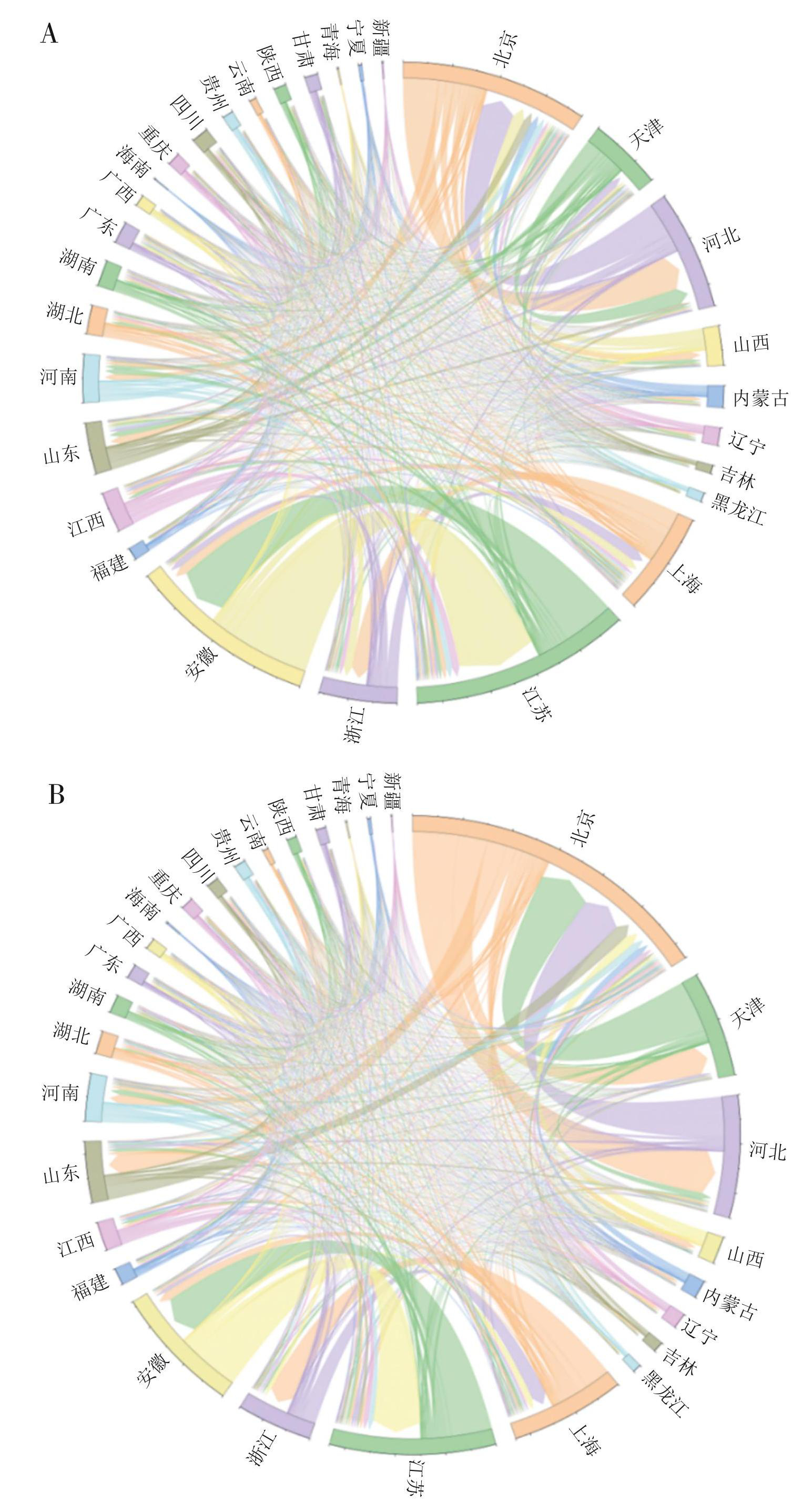 图22017年(A)、2022年(B)各省份耦合协调度的空间联系