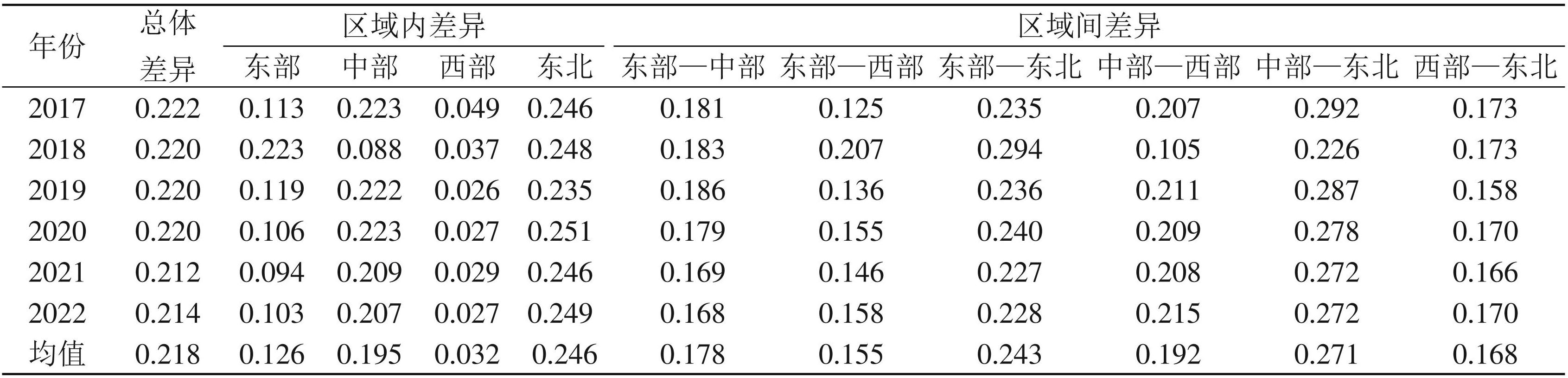 如表3所示,2017—2022年中医药服务与养老服务耦合协调度的总体差异从0.222下降至0.214,年均降幅0.71%,表明二者耦合协调度的空间非均衡程度持续向好。从四大区域的内部差异均值看,东北地区的内部差异最大(0.246),而西部地区的内部差异最小(0.032)。从四大区域的内部差异变化趋势看,东部、中部和西部地区的内部差异均呈下降态势,西部地区降幅最大,表明西部地区各省份中医药与养老服务的协调度逐步趋同;东北地区内部差异略有上升,增幅为0.26%,说明东北地区中医药与养老服务耦合协调发展存在进一步分化的趋势。就区域间差异的均值而言,各区域间的差异由高到低依次为:中部—东北(0.271)、东部—东北 (0.243)、中部—西部(0.192)、东部—中部(0.178)、西部—东北(0.168)、东部—西部(0.155)。值得注意的是,2018年中部—西部地区的差异值显著低于其他年份,这可能与国家加大中西部地区医养结合与中医药服务体系建设的政策推动有关。2017—2018 年,国家卫生健康委等部门陆续出台《“十三五”健康老龄化规划》等举措,强化了对中西部地区的基础设施投资与中医药资源配置支持,带动了西部地区中医药服务供给能力和养老服务覆盖水平的同步提升。同时,中部地区在此期间启动医养结合试点并取得显著进展。而从区域间差异的年际变化幅度来看,东部—中部、东部—东北、中部—东北、西部—东北差距缩小,其中东部—中部的降幅最大(1.49%);东部—西部、中部—西部的差距略有扩大,增幅分别为4.76%、0.84%,这表明东部与西部、中部与西部的中医药服务与养老服务协同发展面临挑战。