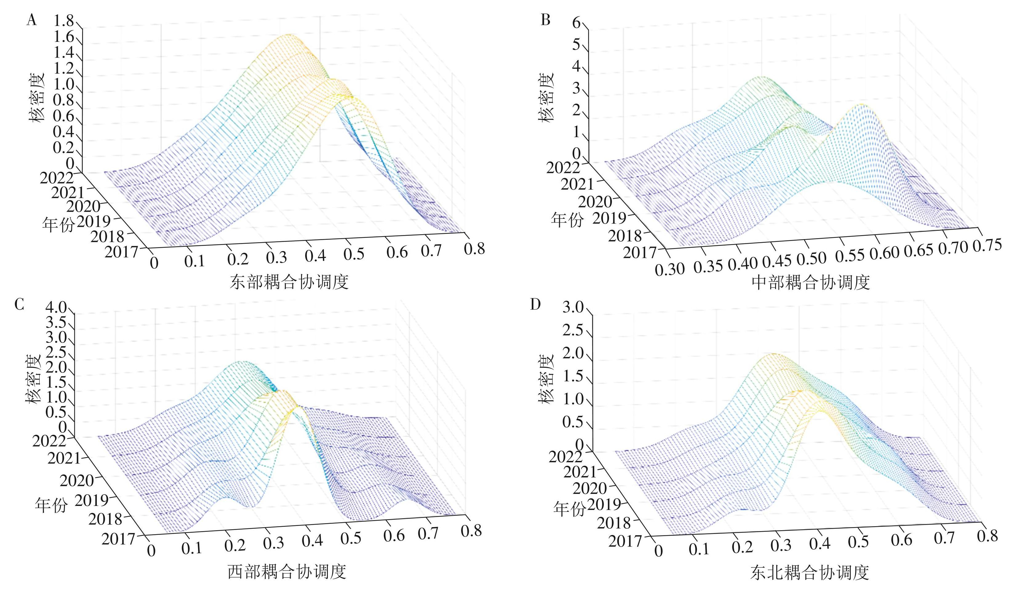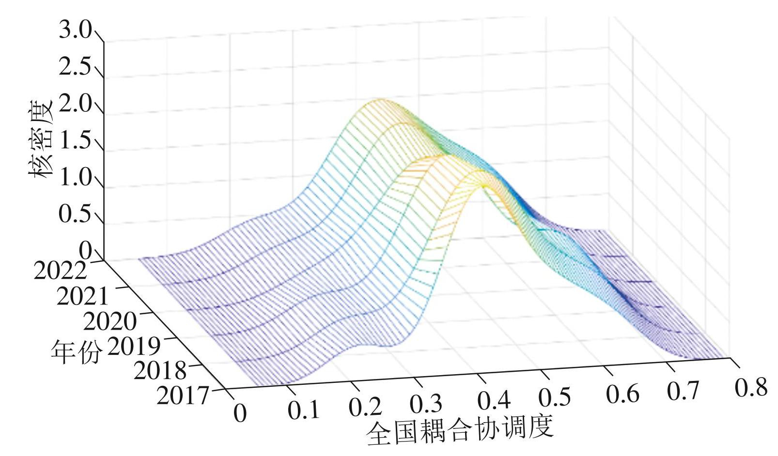 Kernel密度估计是一种非参数检验方法,以核函数对样本点进行平滑加权,将各观测值与带宽代入核函数后线性叠加,得到连续的概率密度曲线,从而直观刻画分布形态[18]。本文使用Matlab2021软件绘制中医药服务与养老服务耦合协调度的Kernel密度曲线。曲线的分布位置反映耦合协调度的高低,曲线的波峰数量体现耦合协调度的极化程度,波峰高度表示区域内集中程度,曲线的分布延展性则反映出最高与最低耦合协调度之间的差距。