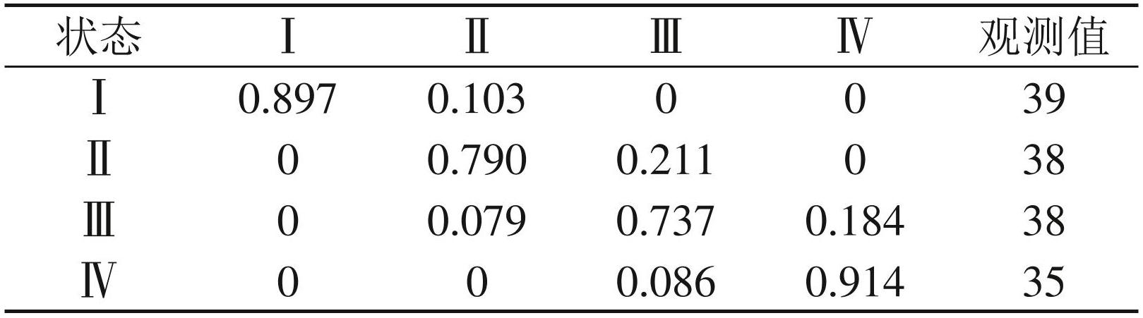 Markov 链是一种描述系统状态随时间转移的随机过程模型,常用于分析状态之间的转移概率与动态演变特征[19]。本文基于Matlab2021软件,利用 Markov 链衡量中医药服务与养老服务耦合协调水平随时间变化的动态转移趋势。通过计算中医药服务与养老服务耦合协调度的四分位数,将其分为低(Ⅰ)、中低(Ⅱ)、中高(Ⅲ)和高(Ⅳ),并构建转移概率矩阵,以反映各类型在观测期内的迁移方向与可能性。