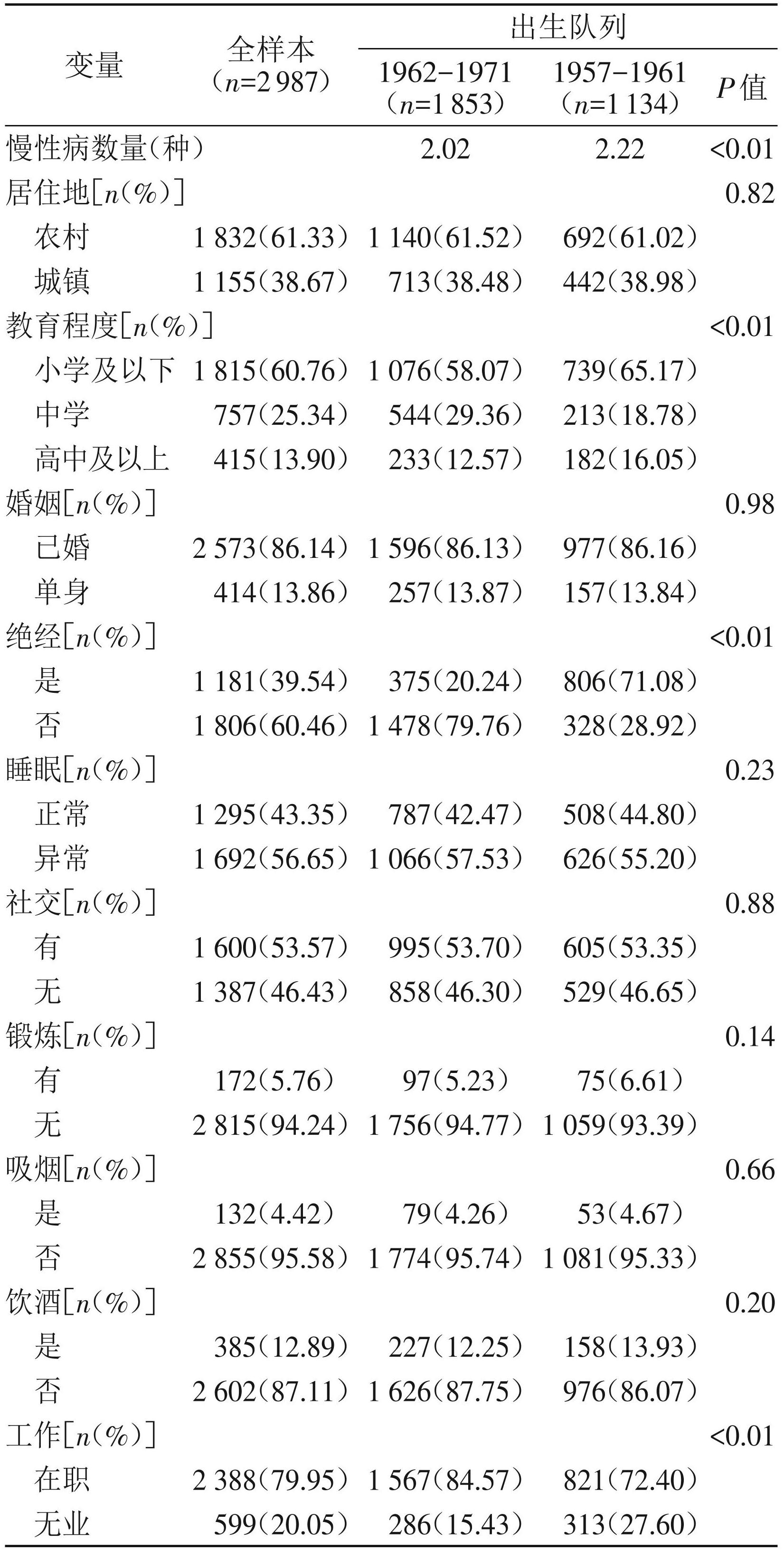 最终纳入分析的样本为 2 987 例,表1显示了在基线调查时全样本以及分出生队列的基本情况。在全样本中,农村居住者 1 832 例(61.33%),城镇 1 155 例(38.67%);1962—1971 年出生队列 1 853例 (62.04%),1957—1961 年1 134 例(37.96%);已婚者所占比例最高[2 573 例(86.14%)];小学及以下文化程度占比最高[1 815 例(60.76%)];未绝经者 1 806 例(60.46%);有社交活动者 1 600 例(53.57%); 无锻炼习惯者占比极高[ 2 815 例(94.24%)];在职者 2 388 例(79.95%);睡眠异常者 1 692 例(56.65%);不饮酒者 2 602 例(87.11%);不吸烟者 2 855 例 (95.58%)。不同出生队列的被调查者在受教育程度、是否绝经、工作状况以及平均慢性病数量等方面有显著差异,出生队列为1957—1961年的女性受教育程度低、绝经、无业的比例以及平均慢性病数量高于出生队列为1962—1971年的女性。基于以上区别,有必要区分出生队列探索慢性病发展轨迹及其影响因素。