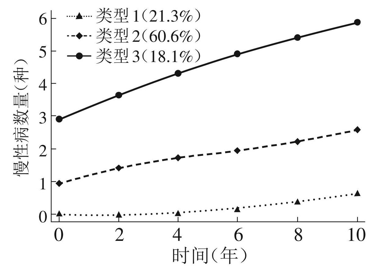 将慢性病发展轨迹按照不同组数(2~5组)和不同阶数拟合,根据评判标准(BIC、AvePP以及各亚组数量占比),最终得到变化阶数为:二次(类型1)、三次(类型2)、二次(类型3)的3个慢性病组的变化轨迹,详见表2。各组慢性病变化轨迹如图1所示,第 1组21.3%个体慢性病数量在初期较低,并且增长速度较慢,随着时间的增加,增速还逐渐减缓,整体依然处于低水平,定义为低水平缓慢增长组。第2组 60.6%个体初始慢性病表现出中等水平的增长,慢性病数量随着时间推移有较为显著的增加,虽然存在增速减缓的趋势,但增长总体上是平稳的,定义为中等水平稳步增长组。第3组18.1%个体初始慢性病水平最高,并且发展速度最快,虽然后期增速放缓,但增速依然明显,定义为高水平快速增长组。