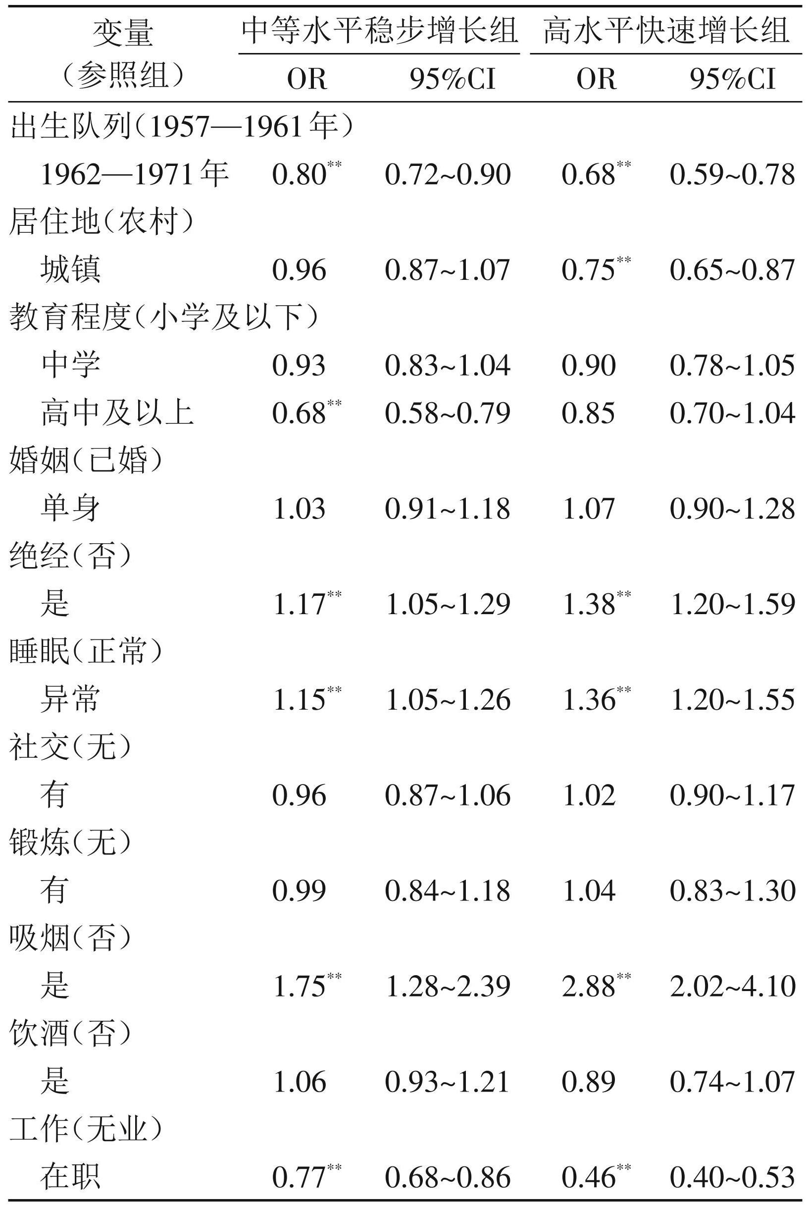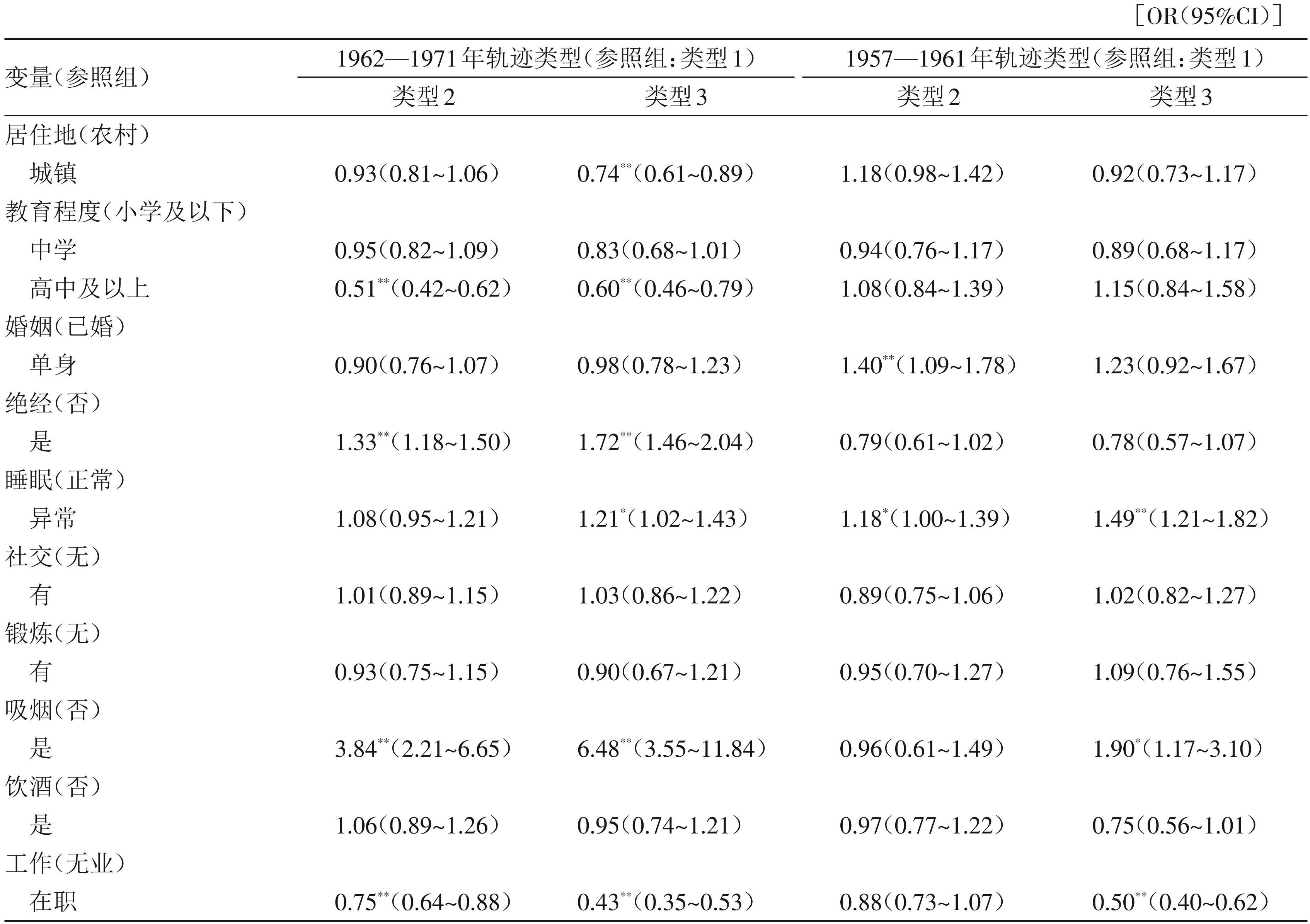 在出生队列为 1962—1971 年的轨迹类型中,相对于归属到类型1(低水平缓慢增长组),未接受过高中教育、绝经、吸烟、无业的女性归属到类型2 (中等水平稳步增长组)的可能性更大;居住在农村、未接受过高中教育、绝经、睡眠异常、吸烟、无业的女性归属到类型 3(高水平快速增长组)的可能性更大。在出生队列为1957—1961年的轨迹类型中,相对于归属到类型 1(低水平缓慢增长组),单身、睡眠异常的女性归属到类型 2(中等水平稳步增长组)的可能性更大;睡眠异常、吸烟、无业的女性归属到类型 3(高水平快速增长组)的可能性更大。