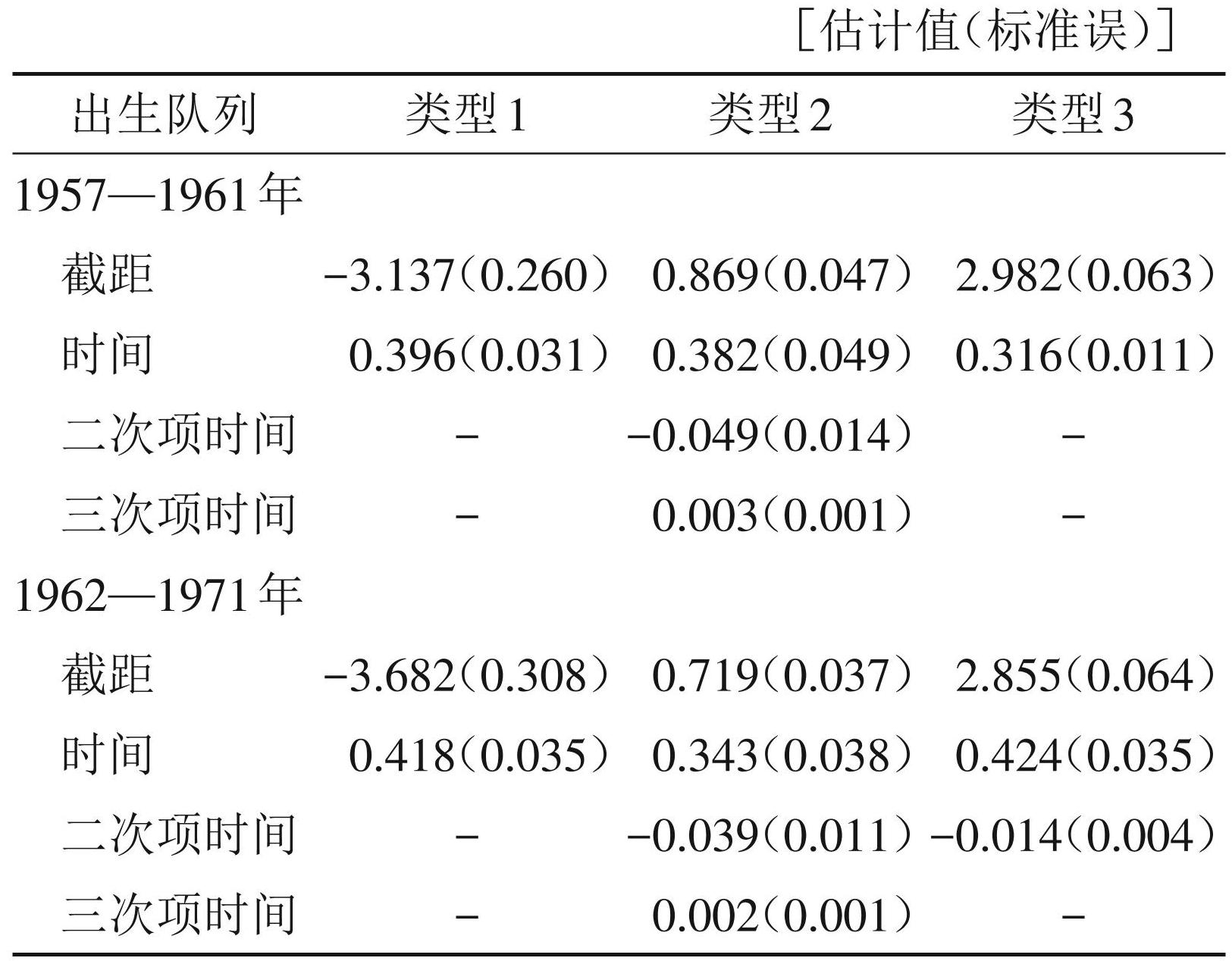 根据样本基本情况将数据集按出生队列分组,探究慢性病发展轨迹,为确定最优轨迹模型,同样分别建立不同组数(2~5组)和不同阶数。综合多项评判标准,最终确定两个出生队列均在分为3类时模型拟合效果最佳。相应轨迹的阶数确定如下:在 1957—1961年出生队列中,慢性病发展轨迹分别为线性、三次和线性;而在1962—1971年出生队列中,则为线性、三次和二次(表4)。