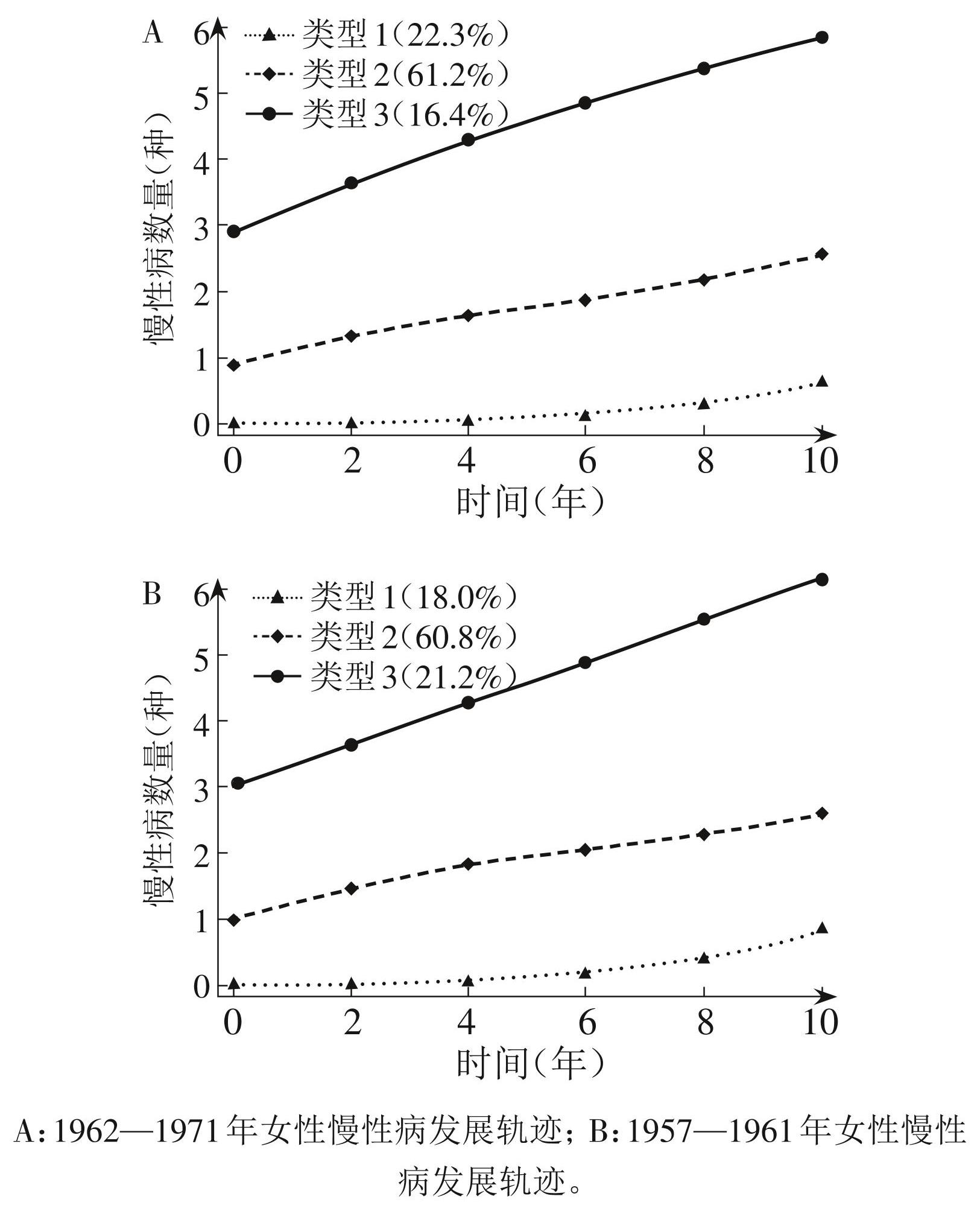 全球人口老龄化态势持续加剧,已成为21世纪重大社会议题之一。在这一背景下,老年女性健康问题日益受到广泛关注,并逐步成为公共卫生政策与临床实践的重点对象。更年期作为女性从中年生殖期过渡到老年期的关键生理阶段,伴随卵巢功能衰退及激素水平变化,发生多种慢性疾病的风险显著上升。近年来,学界针对更年期女性健康开展了一些研究,但现有文献多集中于心理健康[1-3] 及更年期综合征[4-5] 等方面,对慢性疾病发生、发展及其演变规律的关注仍显不足。当前关于慢性病的研究多聚焦于老年群体,对更年期女性慢性病的研究存在三方面明显局限:其一,在研究广度上,已有成果多聚焦于单一高发疾病,如心血管疾病[6-7] 或糖尿病[8] 等,缺乏对疾病集群模式的把握;其二,在研究深度上,国内外现有文献主要围绕发病机制探讨[6]、危险因素识别[7-8] 展开,多属于横断面或基础性研究,未能系统揭示慢性病在更年期这一动态转变过程中的发展轨迹;其三,在研究设计上,大多数研究采用横断面调查,虽可有效描述某一时间点疾病分布状况,却难以捕捉更年期女性慢性病发生、发展的纵向动态规律,尤其缺乏对轨迹分异及其影响因素的队列比较。