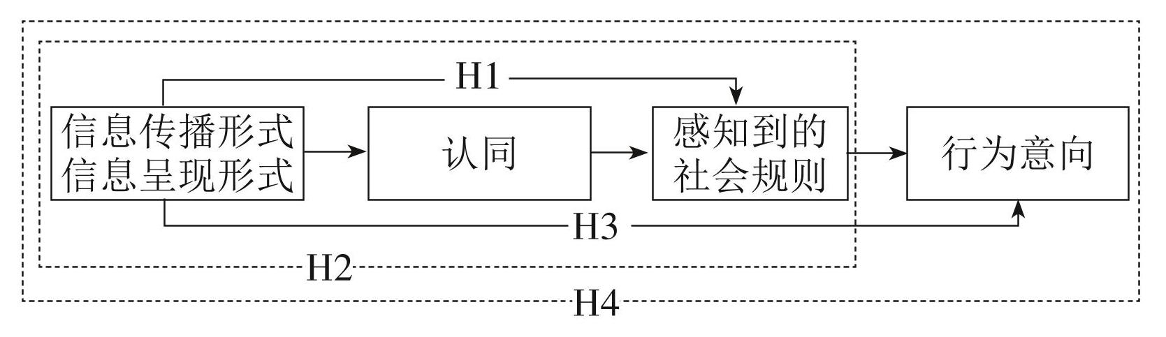 假设4(H4):信息传播形式(叙事vs.非叙事)和信息呈现形式(视频vs.文本)影响个体感知到的社会规则,从而影响个体的行为意向。