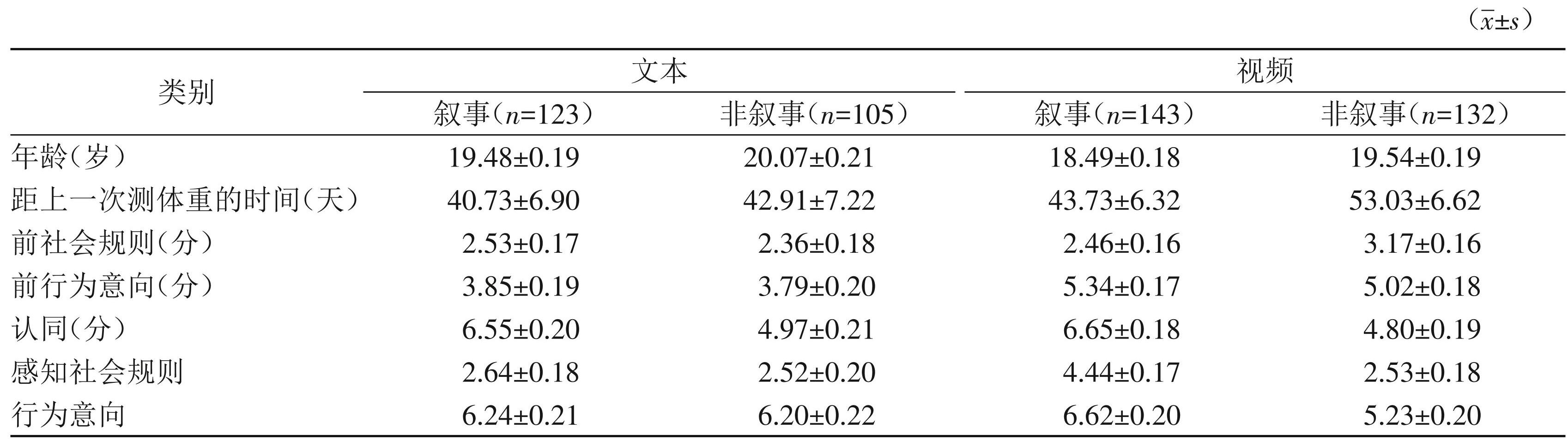 从表1来看,视频组与文本组共503名被试,平均年龄为18.49~20.07岁,其中482名被试在1年内测过体重,占95.8%。不同信息呈现形式下感知社会规则均值为2.52~4.44分,行为意向均值为5.23~6.62分。