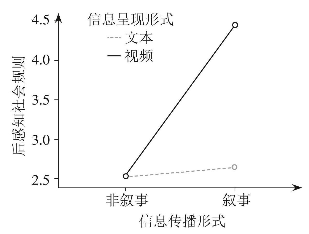 结果显示,信息呈现形式和信息传播形式交互作用显著。①叙事传输主效应显著(F=32.63,P<0.001),说明被试的感知社会规则受叙事或非叙事的影响,叙事或非叙事的条件下,被试感知社会规则差异显著。②前感知社会规则主效应显著(F= 87.86,P<0.001),说明叙事或非叙事条件下,前感知社会规则对被试感知社会规则有影响。③传播途径主效应显著(F=24.51,P<0.001),说明被试的感知社会规则受传播途径的影响,不同传播途径下,被试的感知社会规则差异显著。④信息呈现形式和信息传播形式交互作用显著。如图2所示,当信息传播形式为叙事传输时,文本和视频的感知社会规则差异显著(P<0.001),视频叙事传输的感知社会规则高于文本叙事传输;当信息呈现形式为视频时,叙事和非叙事的感知社会规则差异显著(P<0.001),叙事视频的感知社会规则高于非叙事视频; 当信息传播形式为非叙事传输时,视频和文本的感知社会规则差异不显著;当信息呈现形式为文本时,叙事与非叙事的感知社会规则差异不显著。