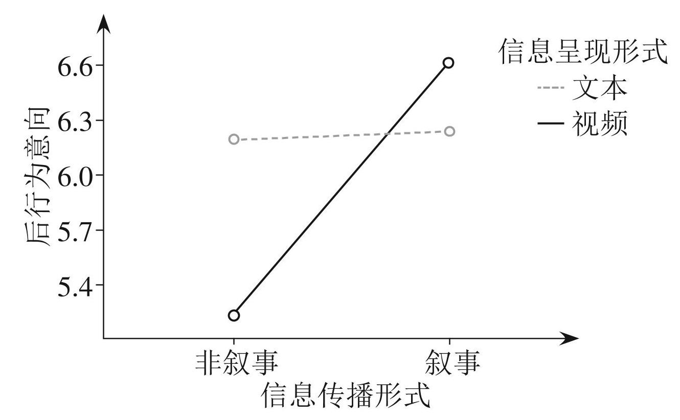 结果显示:①信息呈现形式主效应显著(F= 46.39,P<0.001)。②信息传播形式与信息呈现形式的交互作用显著。如图3所示,当信息呈现形式为视频时,叙事和非叙事的行为意向差异显著(P<0.05),叙事视频的行为意向强于非叙事视频;当信息传播形式为非叙事传输时,视频和文本的行为意向差异显著(P<0.01),文本组的行为意向强于视频组;当信息呈现形式为文本时,叙事与非叙事的行为意向差异不显著;当信息传播形式为叙事传输时,文本和视频的行为意向差异不显著;叙事文本组和非叙事视频组差异显著(P<0.01),叙事文本组的行为意向强于非叙事视频组。