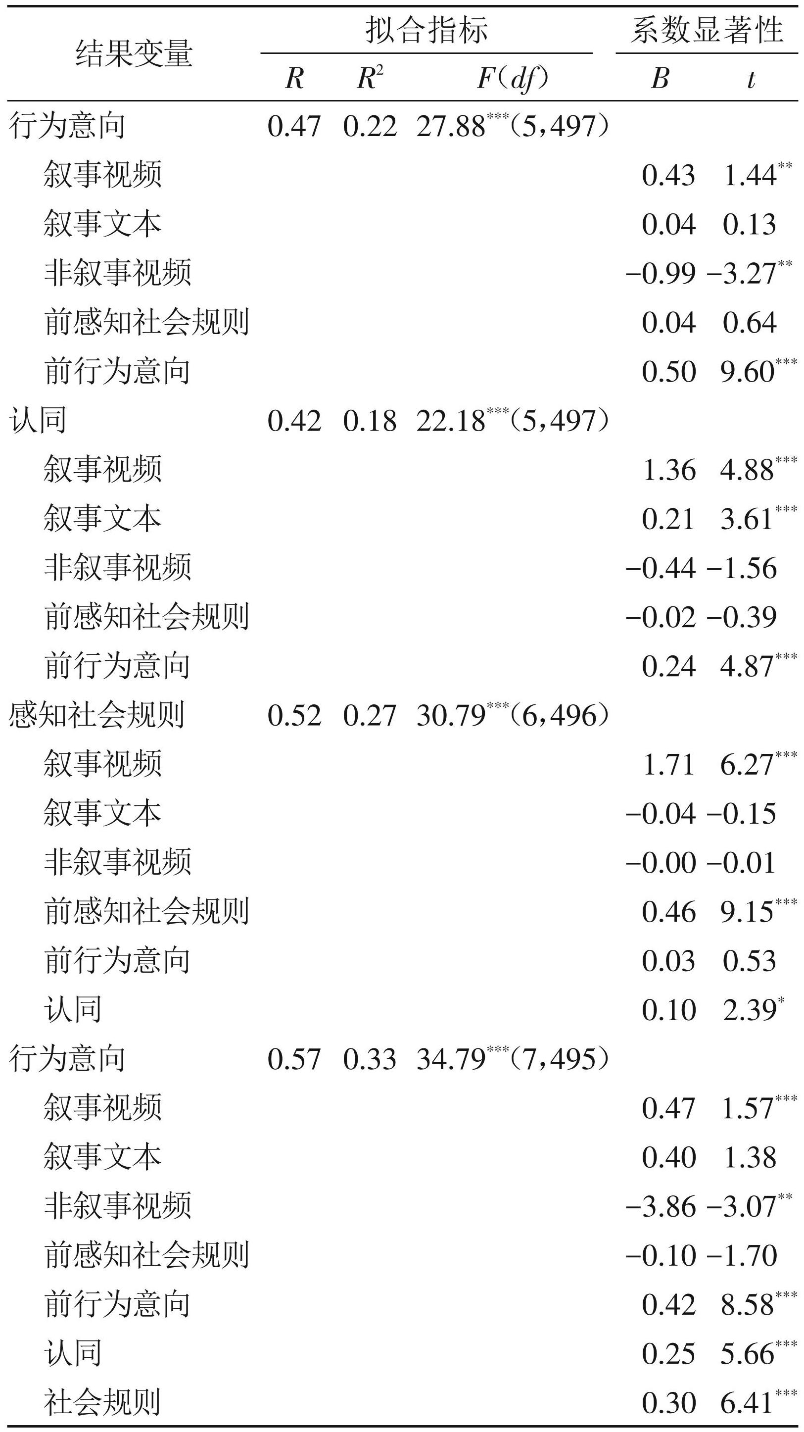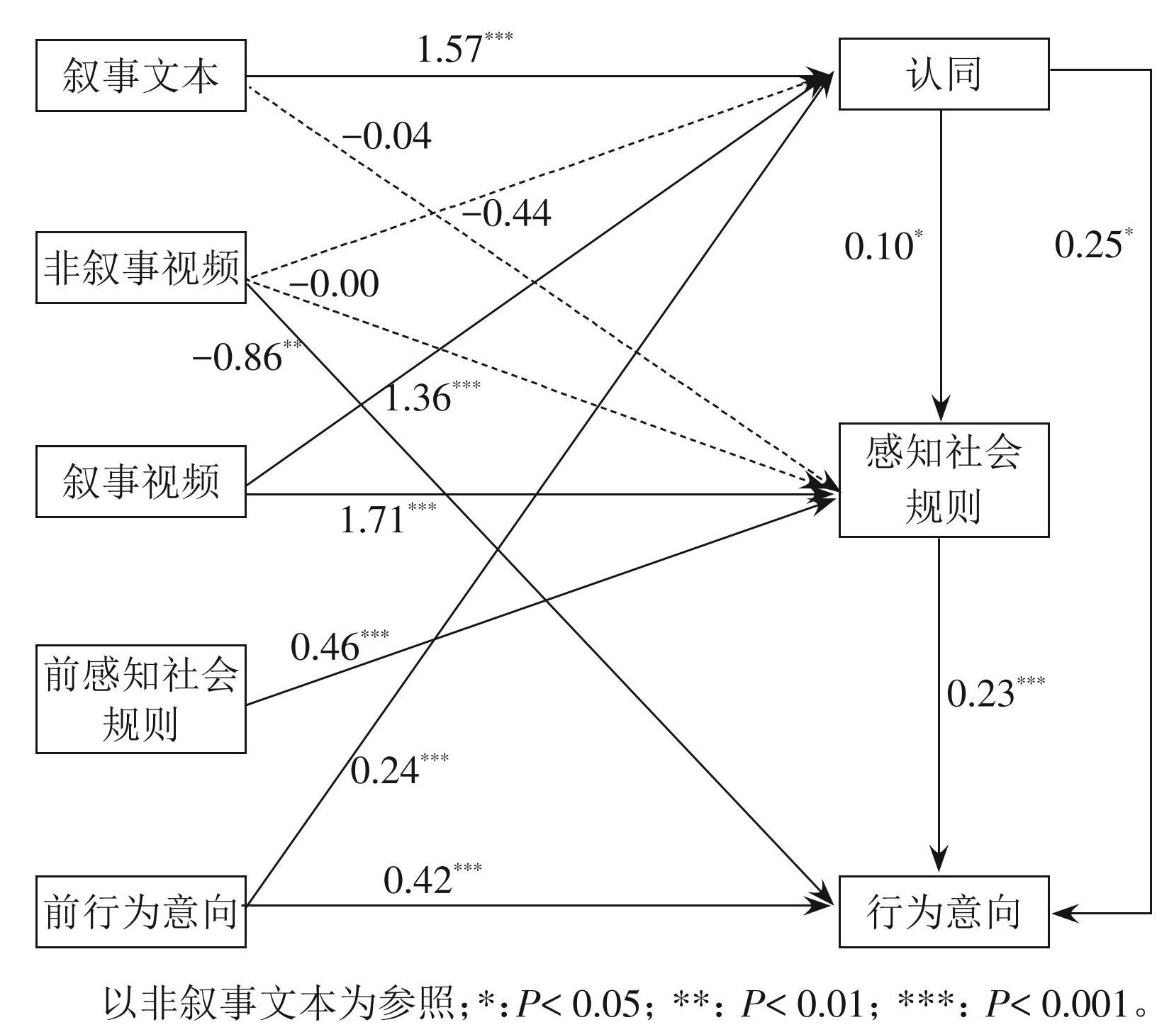 由表2可知,以非叙事文本为参照水平,①叙事视频、前行为意向对行为意向有正向预测作用 (B=0.43、0.50),非叙事视频对行为意向有负向预测作用(B=-0.99),而叙事文本和前感知社会规则对行为意向无显著预测作用。②叙事视频、叙事文本和前行为意向对认同有正向预测作用(B= 1.36、0.21、0.24),而非叙事视频、前感知社会规则对认同无显著预测作用。③叙事视频、前感知社会规则和认同对感知社会规则有正向预测作用 (B=1.71、0.46、0.10),而叙事文本、非叙事视频、前行为意向对感知社会规则无显著预测作用。④叙事视频、前行为意向、认同和感知社会规则对行为意向有正向预测作用(B=0.47、0.42、0.25、0.30),非叙事视频对行为意向有负向预测作用(B=-3.86),而叙事文本和前社会规则对行为意向无显著预测作用。