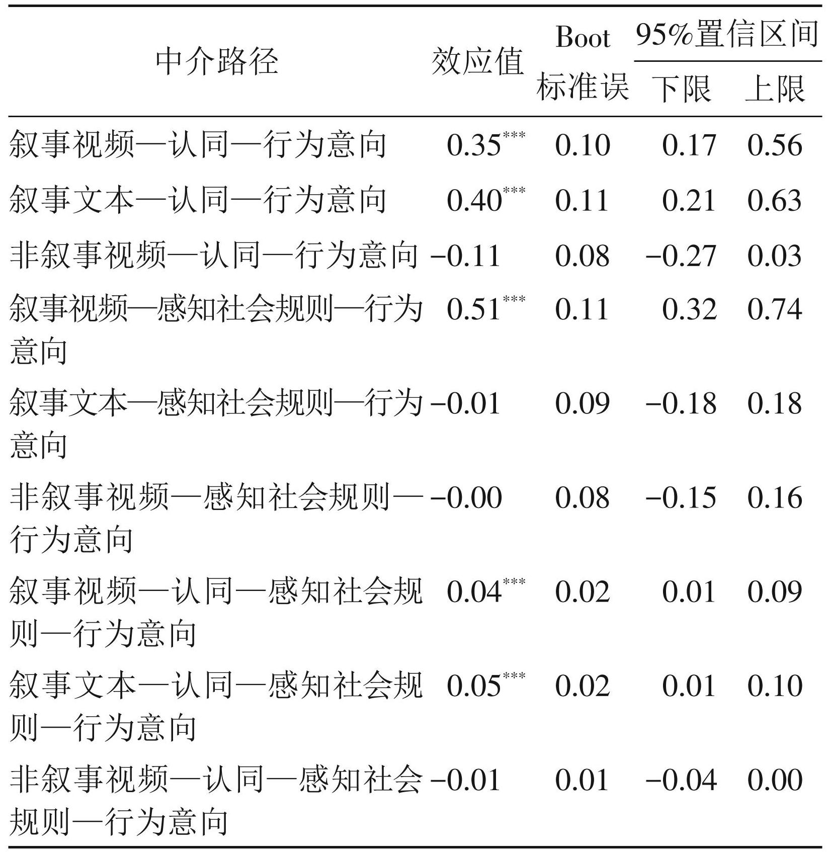 结果表明(表3),当非叙事文本为参照水平时,通过叙事视频—认同—行为意向组成的相对间接效应一(效应值为 0.35),叙事文本—认同— 行为意向组成的相对间接效应二(效应值为 0.40),叙事视频—感知社会规则—行为意向组成的相对间接效应三(效应值为 0.51)进行影响。叙事视频、叙事文本和非叙事视频通过认同和感知社会规则的链式相对中介作用对行为意向产生影响,通过叙事视频—认同—感知社会规则—行为意向组成的相对间接效应四(效应值为 0.04),叙事文本—认同—感知社会规则—行为意向组成的相对间接效应五(效应值为 0.05)进行影响。根据中介效应的判定标准,说明这些路径存在中介效应。具体路径如图4所示。