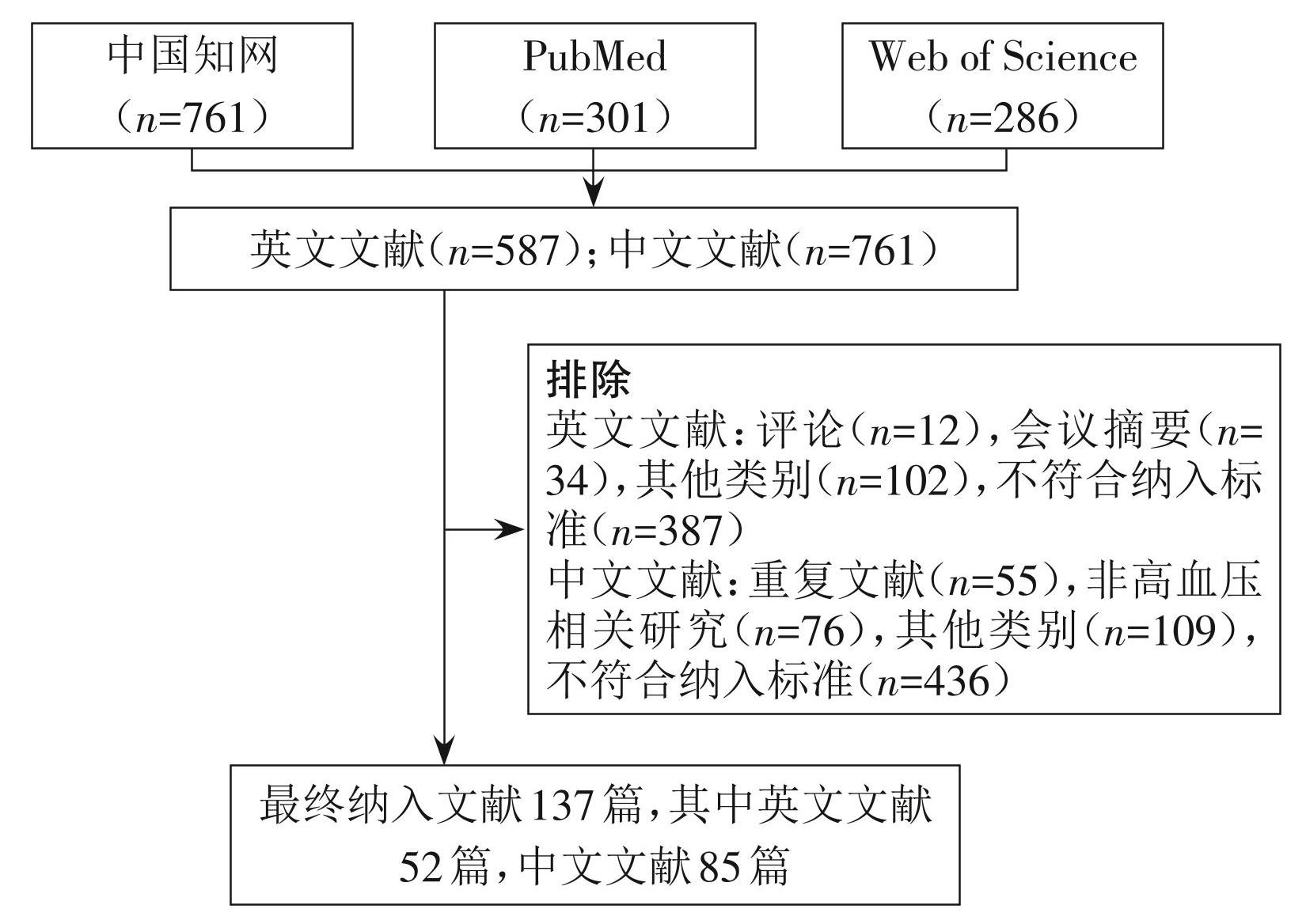 检索得到文献1 348篇(英文文献587篇、中文文献761篇)。由2名研究者独立依据纳入/排除标准筛选文献,对分歧文献通过小组讨论或第三方确定,最终达成一致后纳入分析。经筛选后最终纳入相关文献137篇,其中英文文献52篇,中文文献85篇,筛选流程见图1。