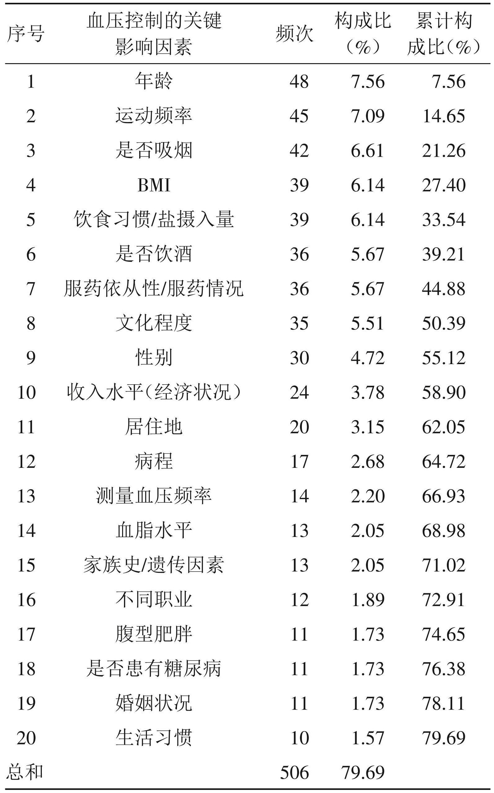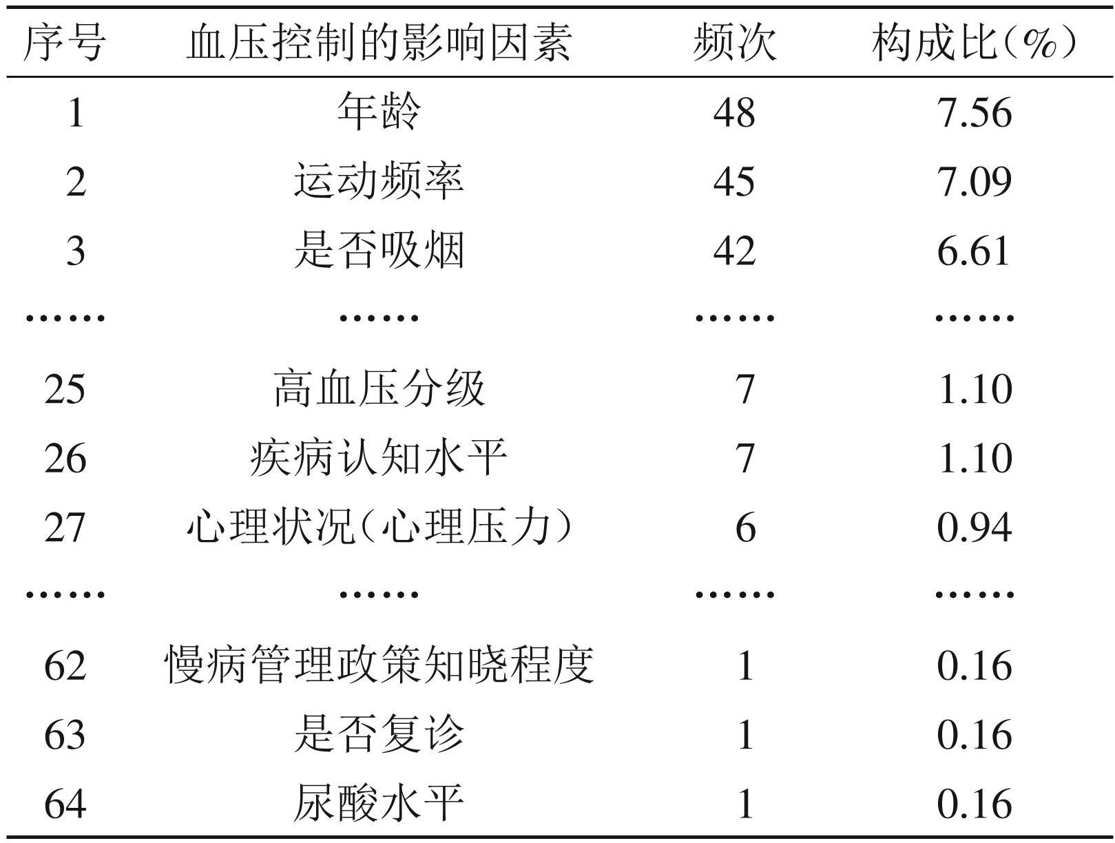 以血压控制的影响因素为研究对象,进行文献分析并提取信息,包括血压控制影响因素频次及其构成比等。共提取血压控制的影响因素 64 项,见表1。结果显示,年龄、运动频率及是否吸烟为频次排名前三的关键因素,累计占比达21.26%。此外,体重指数(body mass index,BMI)(6.14%)、饮食习惯/盐摄入量(6.14%)、是否饮酒(5.67%)及服药依从性(5.67%)等因素也占据较高比重(累计 33.54%)。