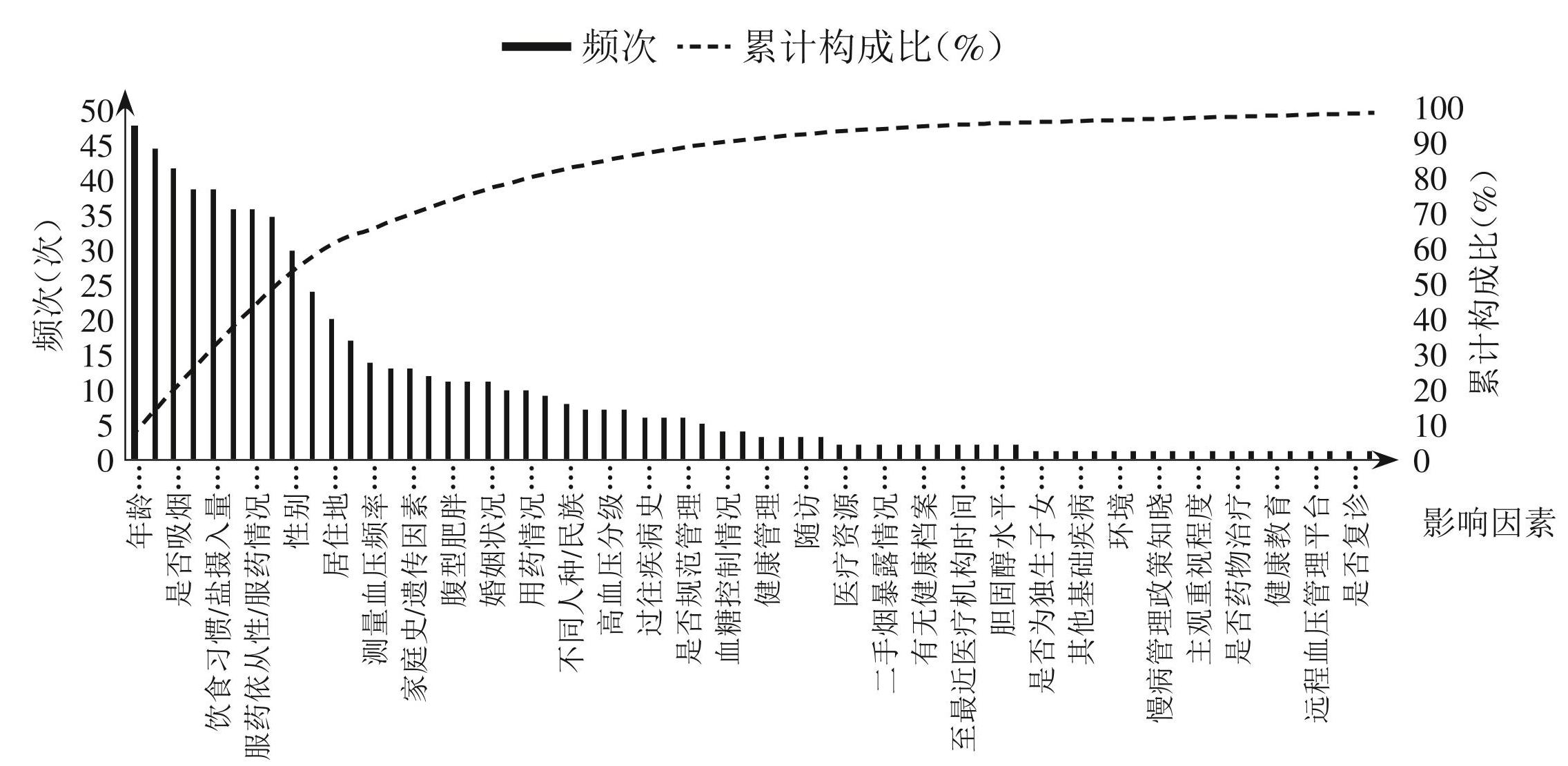 本研究通过以下步骤确定A类关键因素的累计构成比区间(0~80%)[7]:先将提取的全部血压控制影响因素按文献中出现的频次从高到低排序,然后计算每项因素的构成比(频次/总频次×100%)及累计构成比(逐项累加)。帕累托法则认为,约80%的结果由 20%的关键因素导致[8]。本研究结合该原则,将累计构成比达80%的因素归为A类,即关键影响因素,以聚焦资源解决主要矛盾。