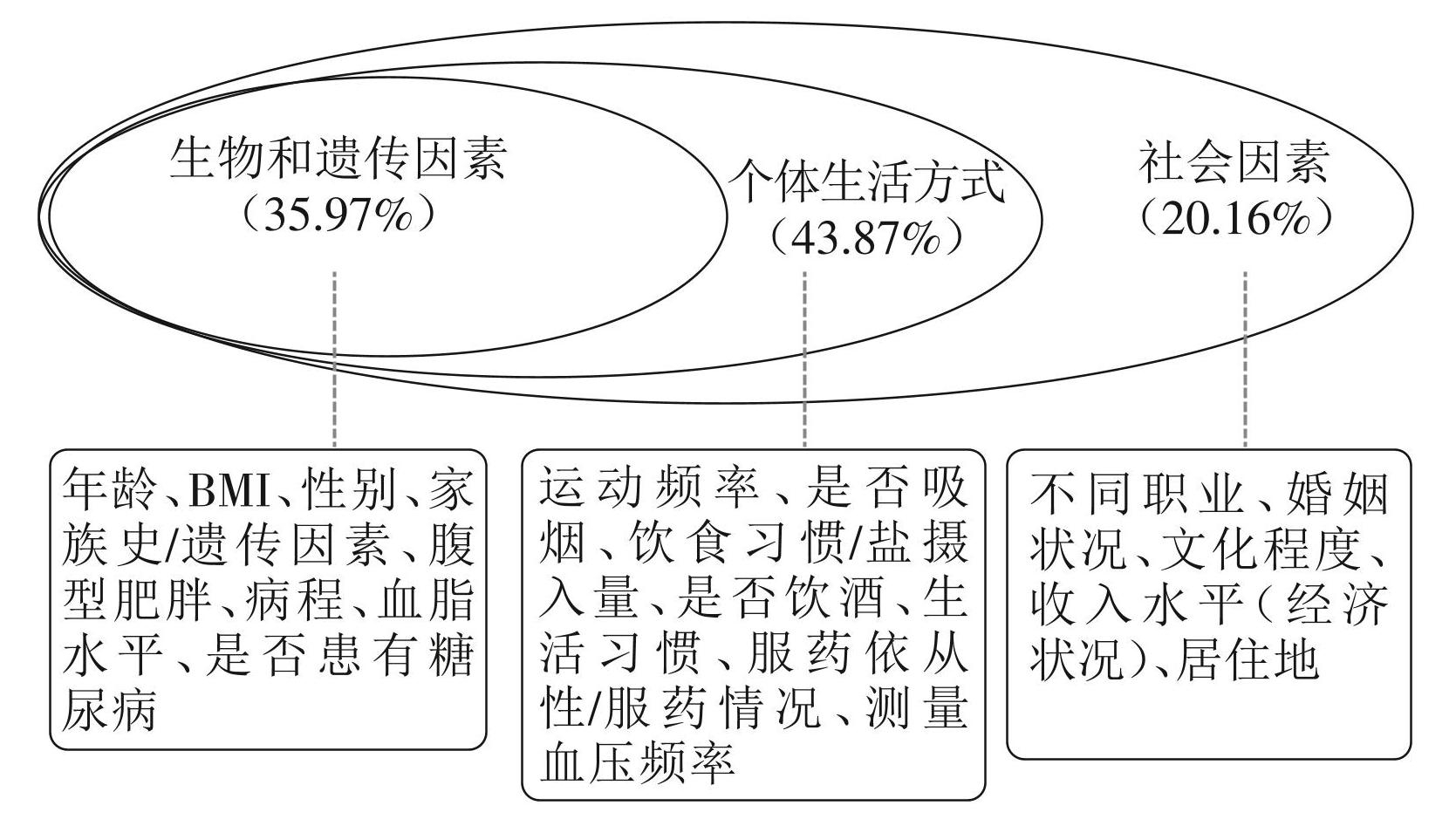 结合健康社会决定因素模型,将以上血压控制的20个关键影响因素分为三个层次,构建血压控制影响因素的社会决定因素模型,并统计各层次影响因素累计构成比情况,如图3所示。生物和遗传因素层(35.97%)、个体生活方式层(43.87%)、社会因素层 (20.16%)这三大层面通过协同作用共同影响血压控制。