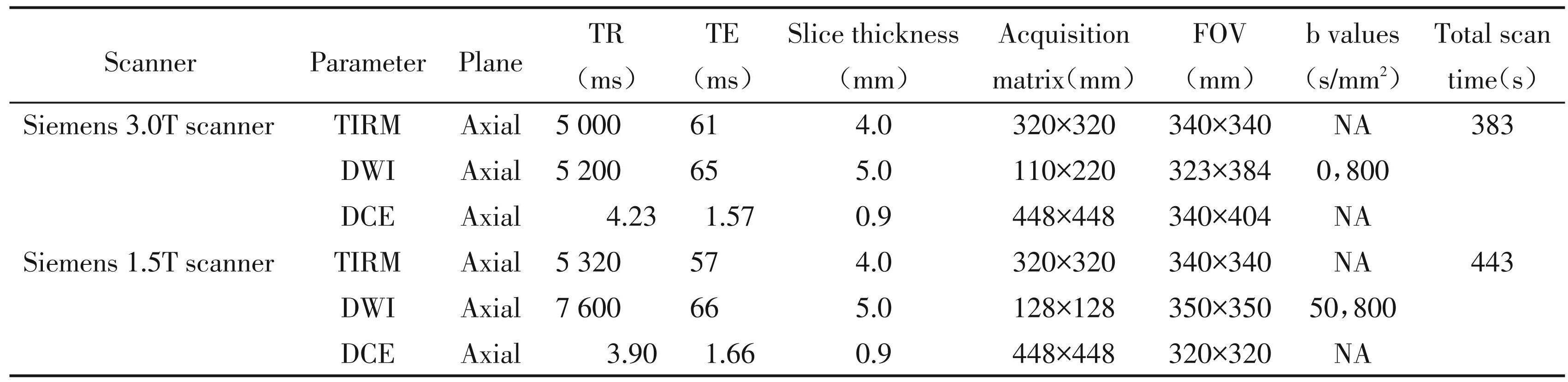 TIRM:T2⁃weighted turbo inversion recovery magnitude;DWI:diffusion weighted imaging;DCE:contrast⁃enhanced T1⁃weighted imaging;TR:repe⁃ tition time;TE:echo time;FOV:field of view;NA:not applicable.