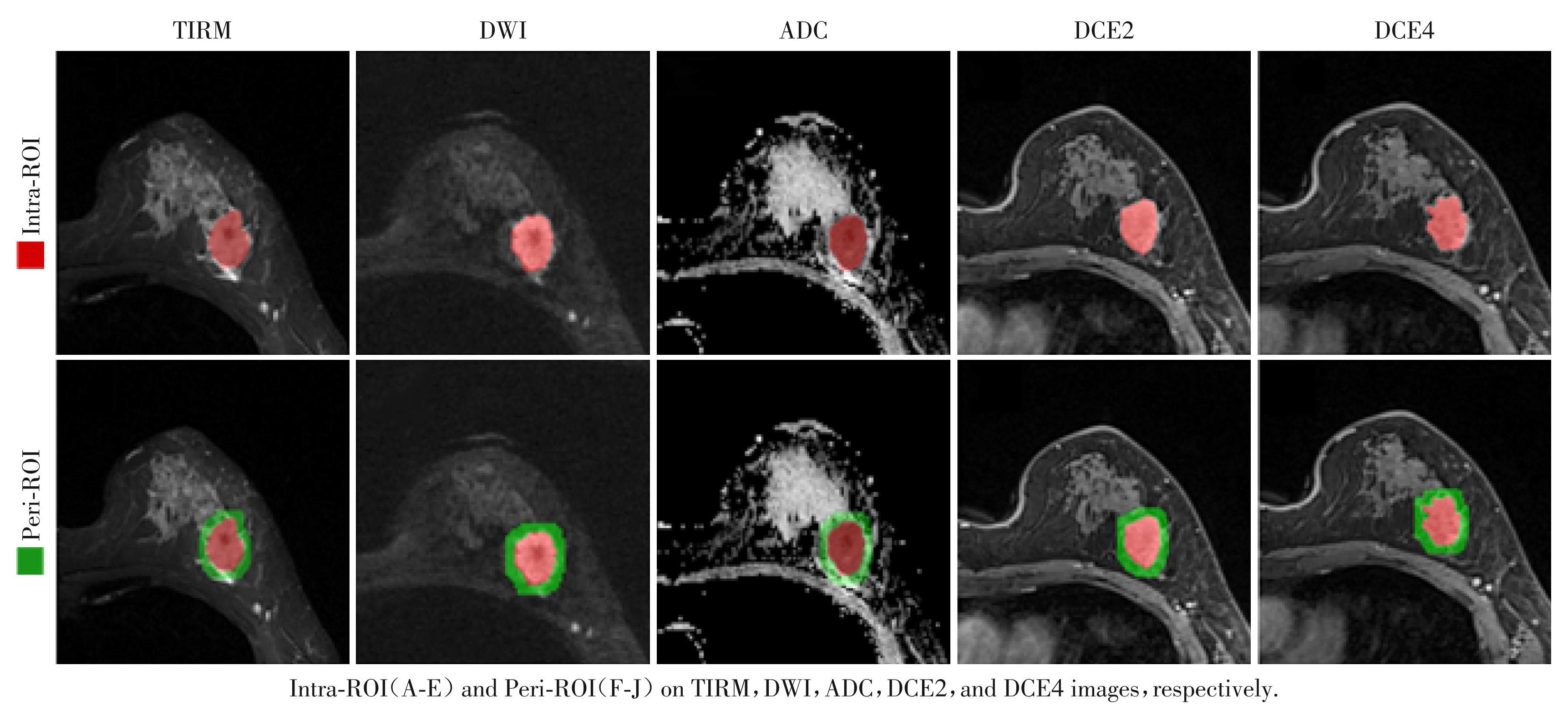 将患者治疗前乳腺MRI中的TIRM、DWI(b值= 800 mm/s2)、ADC 图及动态增强扫描的第 2 期 (DCE2)和第4期(DCE4)从医学影像存储和传输系统(picture archiving and communication systems, PACS)中以 DICOM 格式导入 ITK⁃SNAP 软件(Ver⁃ sion3.8.0)。先由上述阅片者1在各个序列中显示肿瘤面积的最大层面上沿着病灶边缘手动进行瘤内感兴趣区(regionofinterest,ROI)勾画,避开坏死囊变区域,再由阅片者2进行修改和确认。2名阅片者对相应患者的临床病理资料概不知情。随后,使用 Python 软件(Version3.10.9)将勾画好的瘤内 ROI 自动放射状扩张 5 mm,扩张的环形区域即为瘤周 ROI,两者联合的区域即瘤内+瘤周ROI。如果病灶边缘至乳房皮肤或胸壁的距离<5 mm,则将乳房皮肤或胸壁表面到肿瘤边缘的最大可扩区域确定为瘤周 ROI。图像分割过程如图1所示。为了评估勾画结果的可重复性,阅片者 1 在 3 周后随机选择 50例患者图像进行二次分割,并计算组内相关系数 (intraclass correlation coefficient,ICC)。