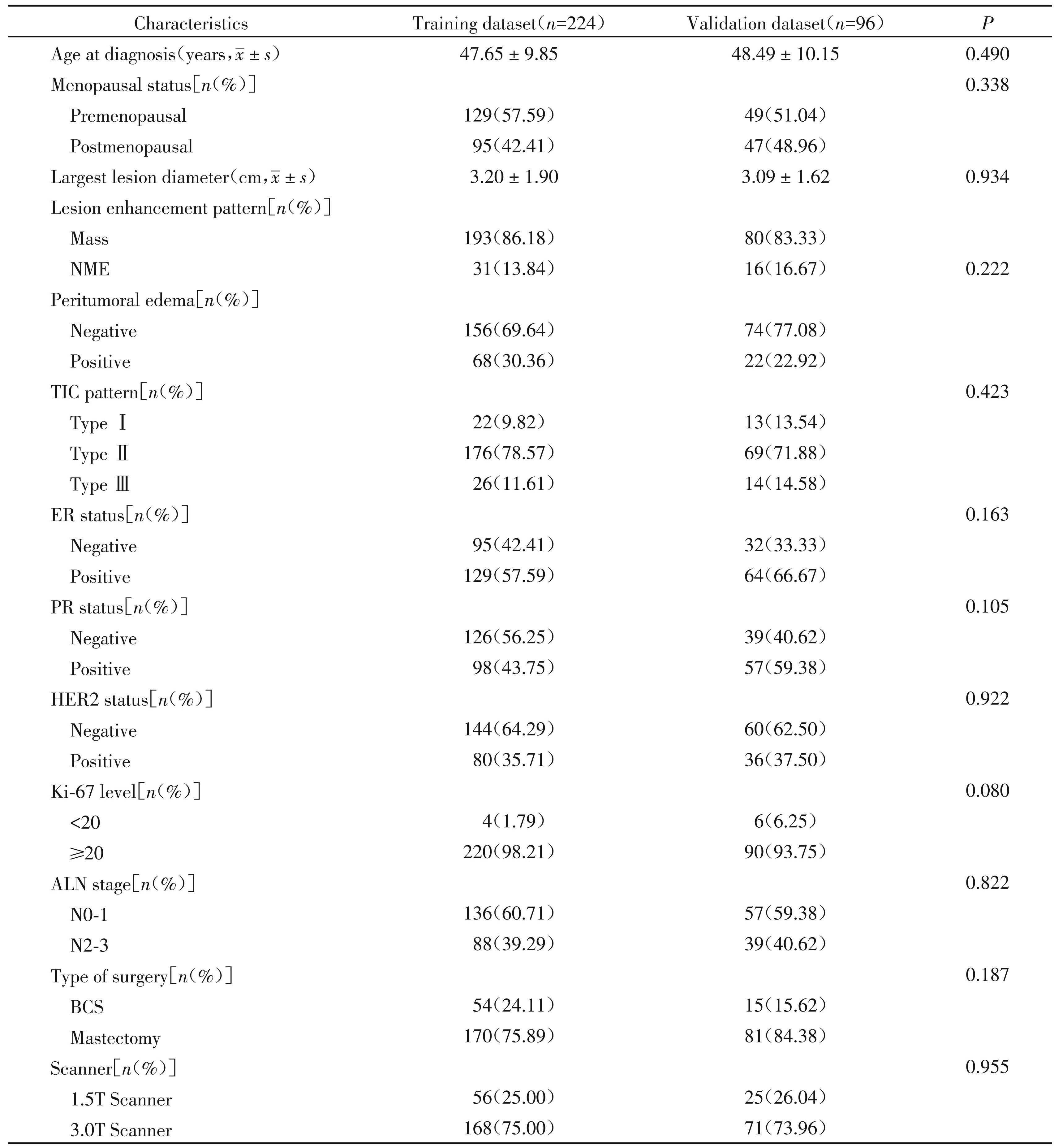 纳入的 320 例浸润性乳腺癌患者中,训练集 224 例,验证集 96 例;N0⁃1 期 ALN 193 例,N2⁃3 期 ALN 127例。在训练集和验证集中,N2⁃3期ALN占比分别为39.3%(88/224)和40.6%(39/96)。两组数据集的基线资料对比见表2,组间各临床病理特征差异均无统计学意义。