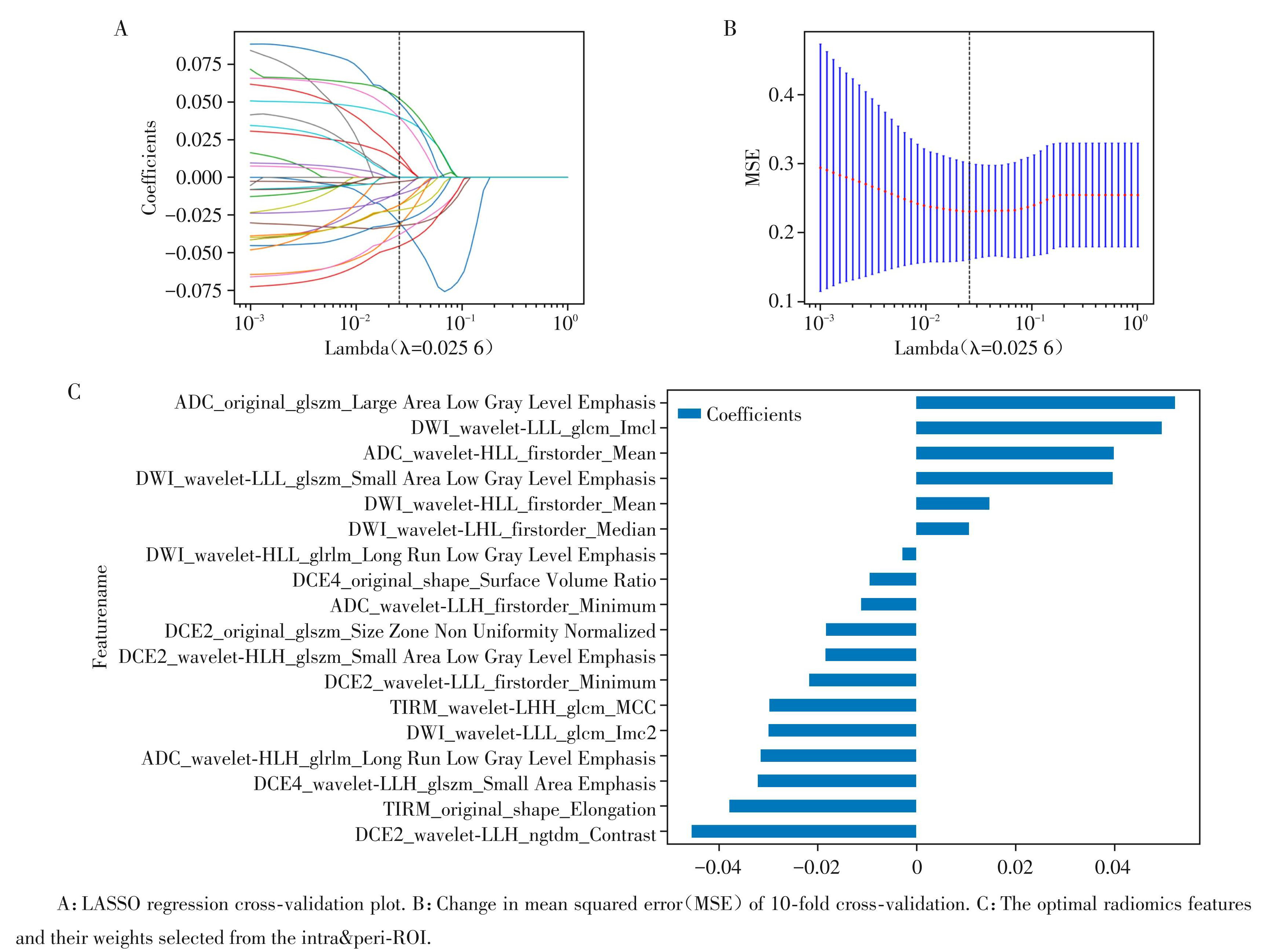 通过 Mann ⁃ Whitney U 检验、mRMR 算法和 LASSO 回归,最终在每位患者的瘤内、瘤周及瘤内+ 瘤周ROI中各选出17、23和18个稳健的影像组学特征用于N2⁃3期ALN预测。随后,通过RF分类器利用所选特征构建3个组学模型,分别是瘤内模型、瘤周模型和瘤内+瘤周模型,并根据各特征权重计算出每位患者中 3 个模型对应的 Radscore,即瘤内 Radscore(intra ⁃ radscore)、瘤周 Radscore(peri ⁃ rad⁃ score)和瘤内+瘤周 Radscore(intra&peri⁃radscore)。图2描绘了LASSO回归的过程及所选特征的权重。