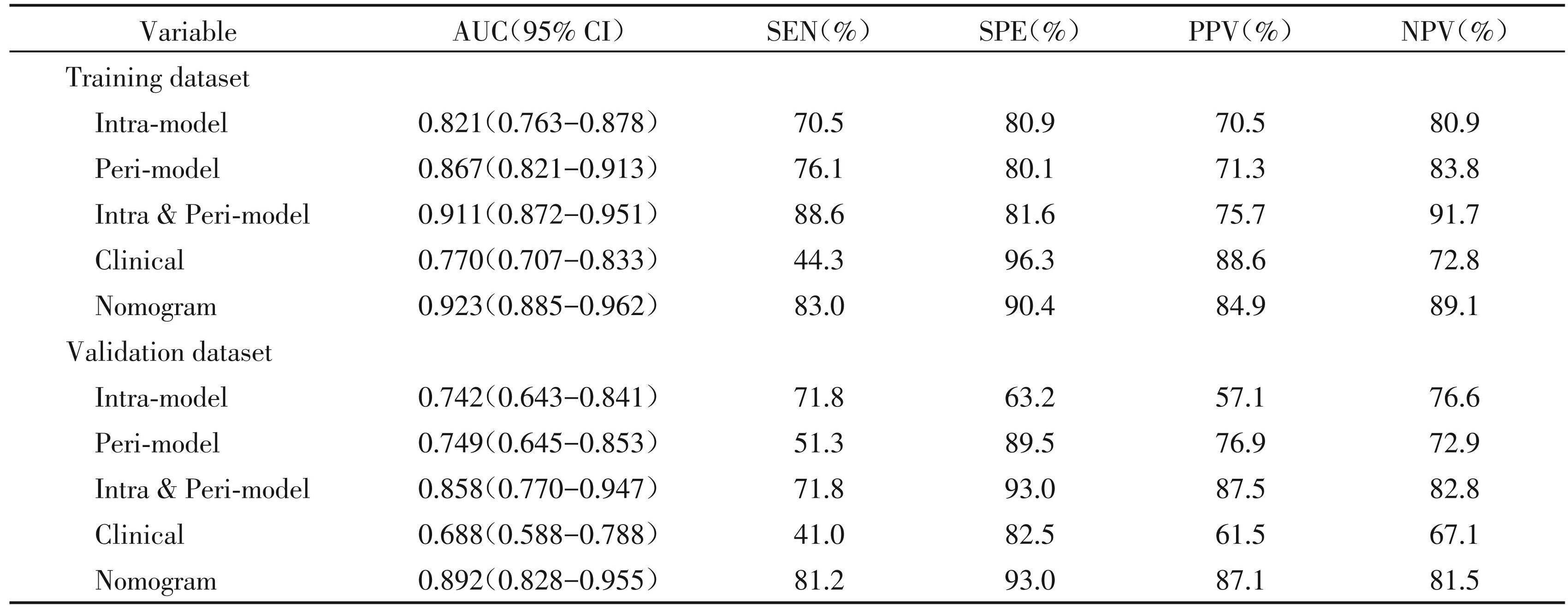 如表3所示,瘤内模型、瘤周模型和瘤内+瘤周模型的 AUC 值在训练集中分别为 0.821(95%CI: 0.763~0.878)、0.867(95% CI:0.821~0.913)和 0.911 (95% CI:0.872~0.951),在验证集中分别为 0.742 (95%CI:0.643~0.841)、0.749(95%CI:0.645~0.853) 和 0.858(95%CI:0.770~0.947)。可以发现,在两组数据集中,瘤内+瘤周模型的AUC值均高于瘤内模型和瘤周模型(均P <0.05),表明前者对于N2⁃3期 ALN具有更好的预测效能。