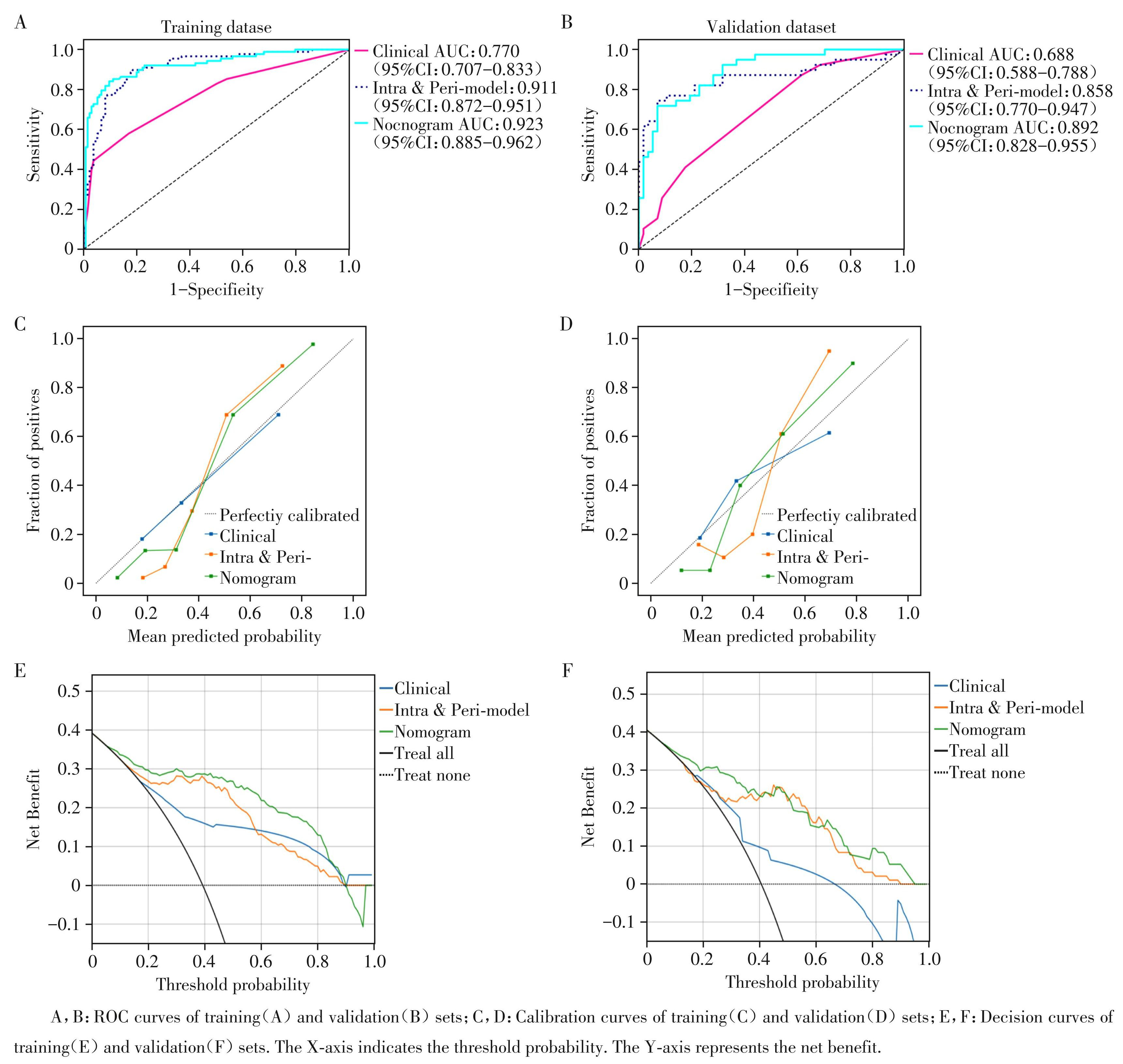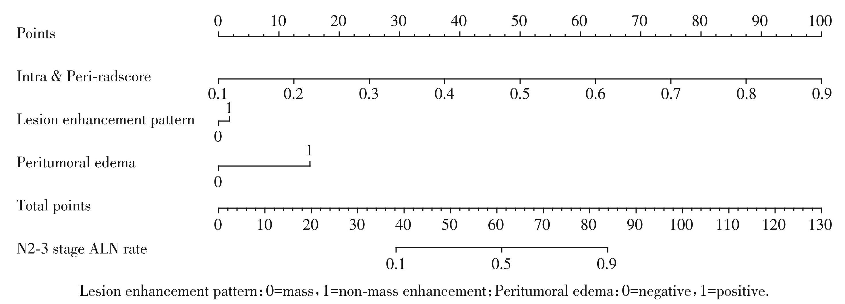 综上所述,基于乳腺癌瘤内及瘤周联合区域的多参数MRI影像组学特征是预测N2⁃3期ALN的有效方法。整合瘤内和瘤周组学特征与 MRI 报告的瘤周水肿和病灶强化形态开发的列线图,对N2⁃3期 ALN具有较好预测效能,可为侵袭性乳腺癌患者的个性化治疗提供无创且可靠的术前指导。