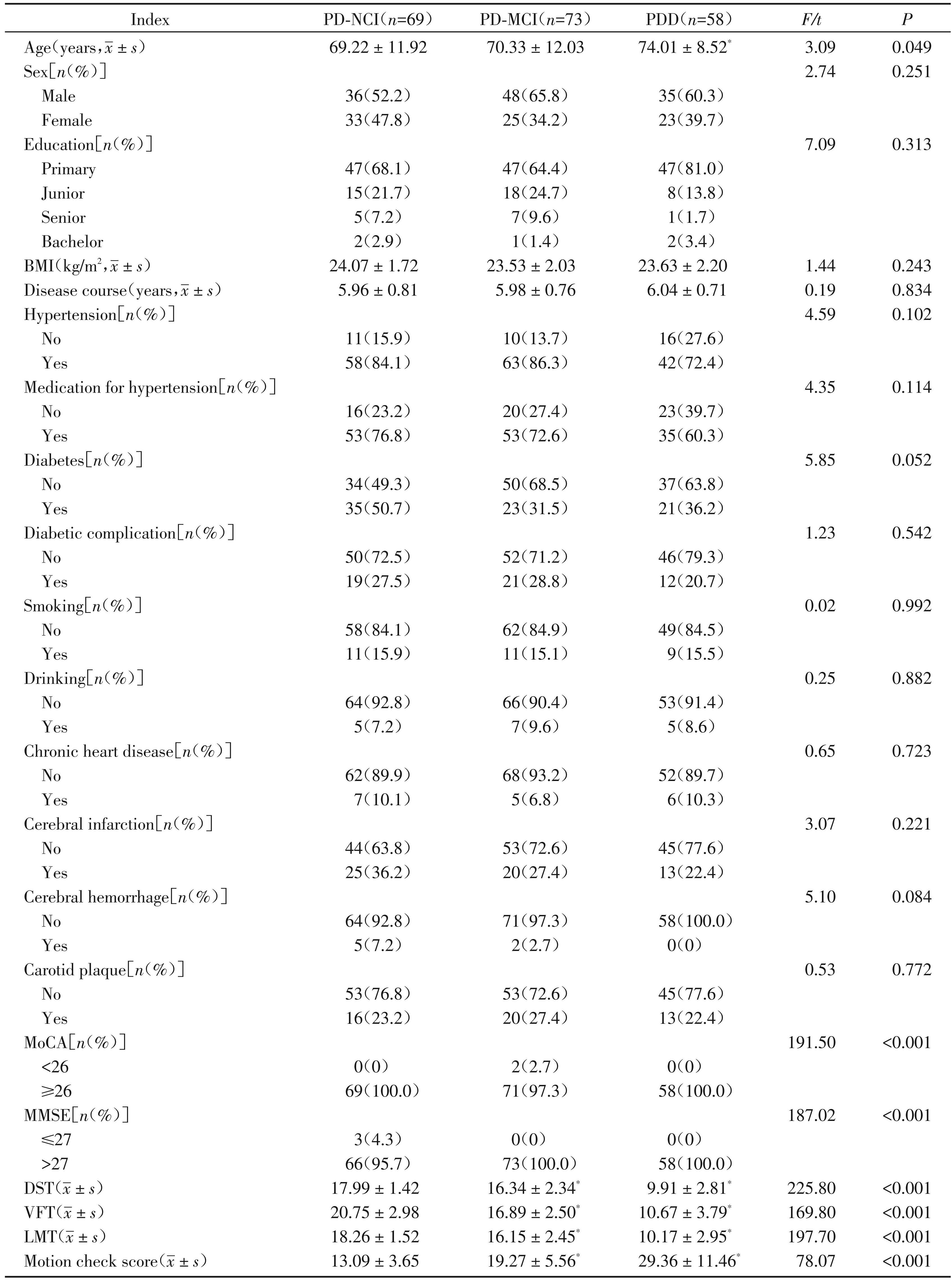 年龄方面,PDD组的平均年龄显著高于PD⁃NCI 组(P=0.031),表明年龄可能是认知障碍加重的一个因素。但PD⁃MCI组与PDD组,PD⁃NCI组与PD⁃MCI组年龄差异无统计学意义(P >0.05)。其他社会人口学变量如性别、教育程度、体重指数(body mass index,BMI)、病程、高血压病史、高血压用药史、糖尿病史、糖尿病并发症、吸烟史、饮酒史、慢性心脏疾病、脑梗死史、脑出血史、颈动脉斑块在各组间的差异均无统计学意义(表1,P >0.05)。不同量表和评分都表现出组间差异,表明诊断标准和量表评判标准的一致性。