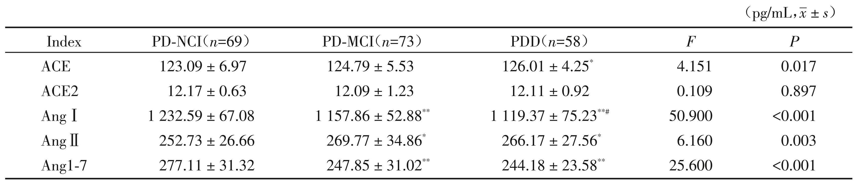 对各组间进行两两比较及Bonferroni多重校正后,结果显示:运动障碍早期且无认知障碍组与运动障碍晚期且有认知障碍组在 ACE 水平上存在显著差异;AngⅠ在各组间均存在显著差异,提示与PD 病程进展相关;AngⅡ在运动障碍早期且无认知障碍组与运动障碍中晚期且无认知障碍组、运动障碍中晚期且无认知障碍组与运动障碍早期且有认知障碍组间存在显著差异;Ang1⁃7在运动障碍早期且无认知障碍组与运动障碍中晚期且无认知障碍组、运动障碍早期且无认知障碍组与运动障碍晚期且有认知障碍组间存在显著差异(图2)。