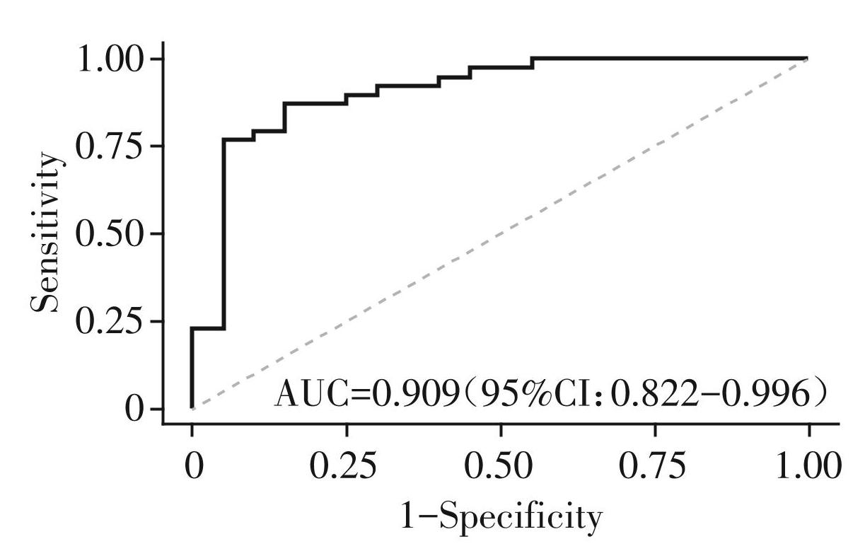 将 200 例患者分为两组,第 1 组为 PD⁃NCI 组 69 例,第2组为PD⁃MCI组73例和PDD组58例。使用随机森林方法,将表1和表2中差异有统计学意义的变量纳入模型,即 ACE、AngⅠ、AngⅡ、Ang1⁃7 及年龄,之后构建了 PD 认知障碍预测模型。该模型由随机抽取的 70% PD 患者组成的训练集构建,并在剩余 30% PD 患者组成的验证集上进行测试。对模型的贡献值由大到小依次为 AngⅠ、Ang1⁃7、 ACE、AngⅡ和年龄。通过十折交叉验证,发现在 mtry=2时,模型的准确度最高。之后将最优的模型参数应用到验证集中进行预测,发现该模型在验证集中的准确度为0.847,AUC为0.909(95%CI:0.822~0.996),表明其在预测PD认知障碍方面具有较好的性能(图1)。