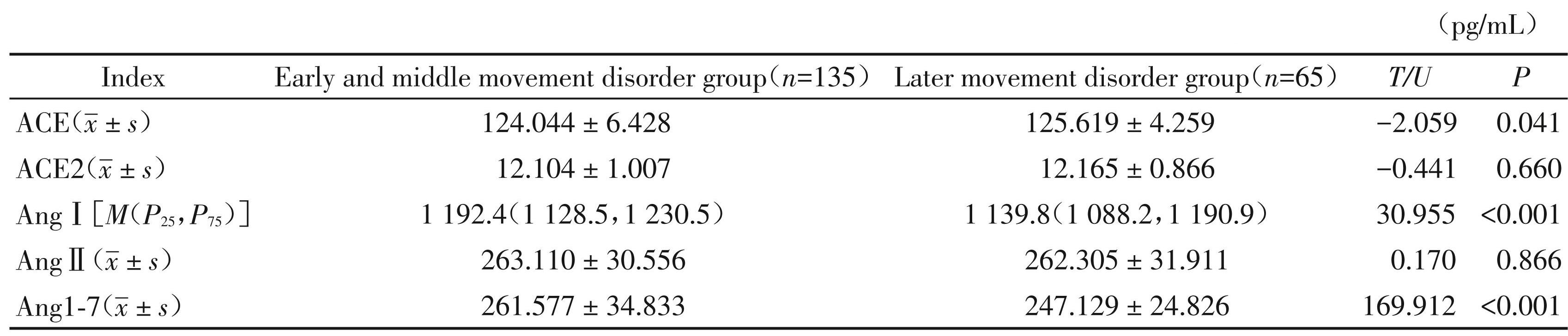 本研究的创新之处在于论证了 Ang 及 ACE 在 PD认知障碍和运动障碍患者中的表达差异及相互作用。然而,本研究仍存在以下不足:①本研究中纳入的样本量相对较少,后续研究可以通过纳入更多病例来论证本研究的结果;②作为神经退行性疾病,年龄是PD最重要的因素,同一年龄PD患者发病时间可能不一样,本研究未将发病时间作为协变量纳入分析可能导致相应的偏倚;③本研究未深入探讨RAS相关指标之间可能存在的相互作用,可能会放大或者缩小某些分子的效应。