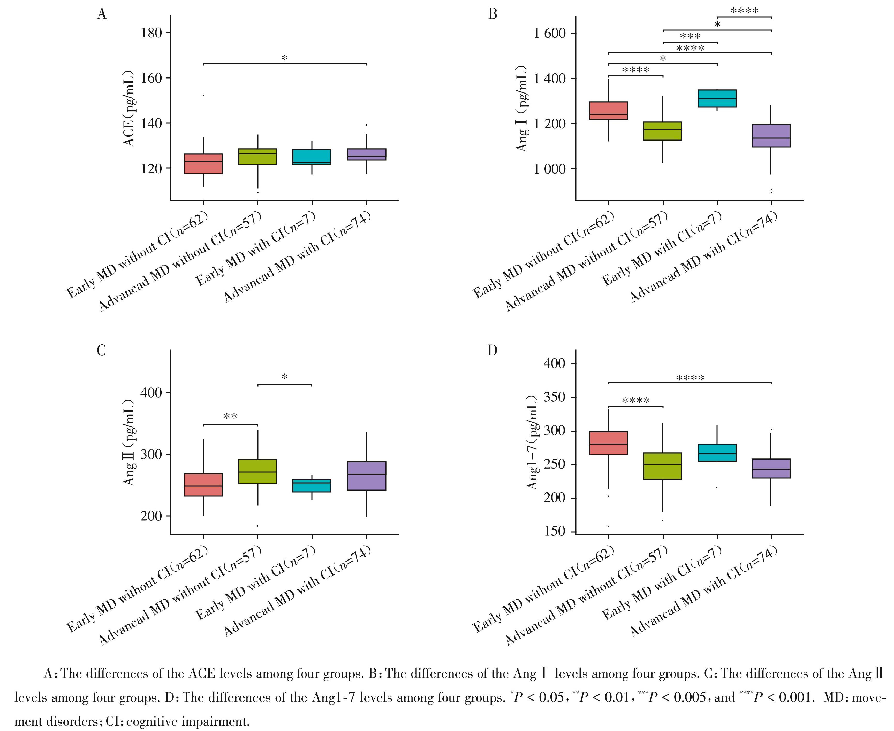 根据患者有无PD认知障碍与运动障碍分成4组,包括运动障碍早期且无认知障碍组62例、运动障碍中晚期且无认知障碍组57例、运动障碍早期且有认知障碍组 7 例以及运动障碍晚期且有认知障碍组 74例,探讨4组RAS指标差异是否有统计学意义。并对各组的ACE、AngⅠ、AngⅡ和Ang1⁃7水平进行了比较分析。