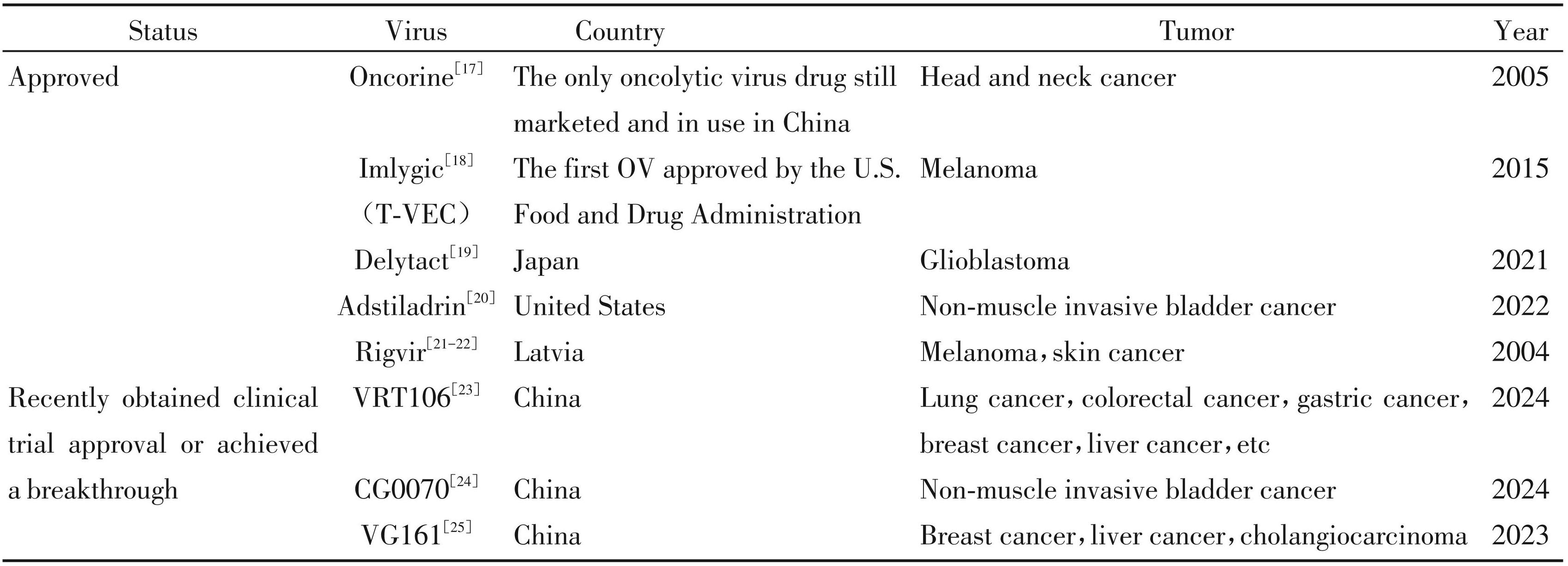 溶瘤病毒疗法(oncolytic virus therapy,OVT)是一种正被广泛研究的新型生物疗法。临床上使用的大多数溶瘤病毒(oncolytic virus,OV)都是由减毒或非致病性毒株改造而成的[7],通过利用肿瘤细胞与正常细胞在遗传特征和表观遗传上的差异,如原癌基因激活、抑癌基因失活、肿瘤细胞表面受体高表达、缺氧酸性的肿瘤微环境(tumor microenvironment,TME) 以及信号通路异常等,OV 可以选择性地识别并在肿瘤细胞中复制,而不影响正常细胞生长[8-9]。如脑胶质瘤细胞高表达CD155(脊髓灰质炎病毒受体),使得脊髓灰质炎病毒能够特异性地识别并结合 CD155,从而进入肿瘤细胞,正常细胞在感染脊髓灰质炎病毒后可以通过表达干扰素(interferon,IFN)和 p53介导的细胞凋亡清除病毒,而肿瘤细胞由于这一途径缺陷失去抗病毒能力[10]。人们最早在白血病患者中发现了 OV[11],而后发现狂犬病疫苗可以抑制宫颈癌,引发了研究者对某些病毒抗瘤功能的思考。随后的研究中发现了许多具有杀灭肿瘤细胞功能的病毒,从而形成了OVT的概念。最初的研究主要集中在天然野生病毒上。20世纪50年代的一项临床试验使用了野生型和非工程化腺样体咽结膜病毒治疗宫颈癌[12]。随着基因工程技术的发展,重组选择性增强病毒和治疗性转基因OV也得到了广泛研究[13-14]。目前,OVT的研究尚在初级阶段,但已有数款产品获得临床批准。表1介绍了当前OV产品获批上市情况。OVT 的给药途径多样,包括静脉、皮内、瘤内、动脉、胆道内注射[15] 及纳米颗粒递送等[16]。虽然目前尚无被批准专门用于BC治疗的 OV,但近年来大量的临床前试验证明了 OVT 应用于BC的巨大潜力。