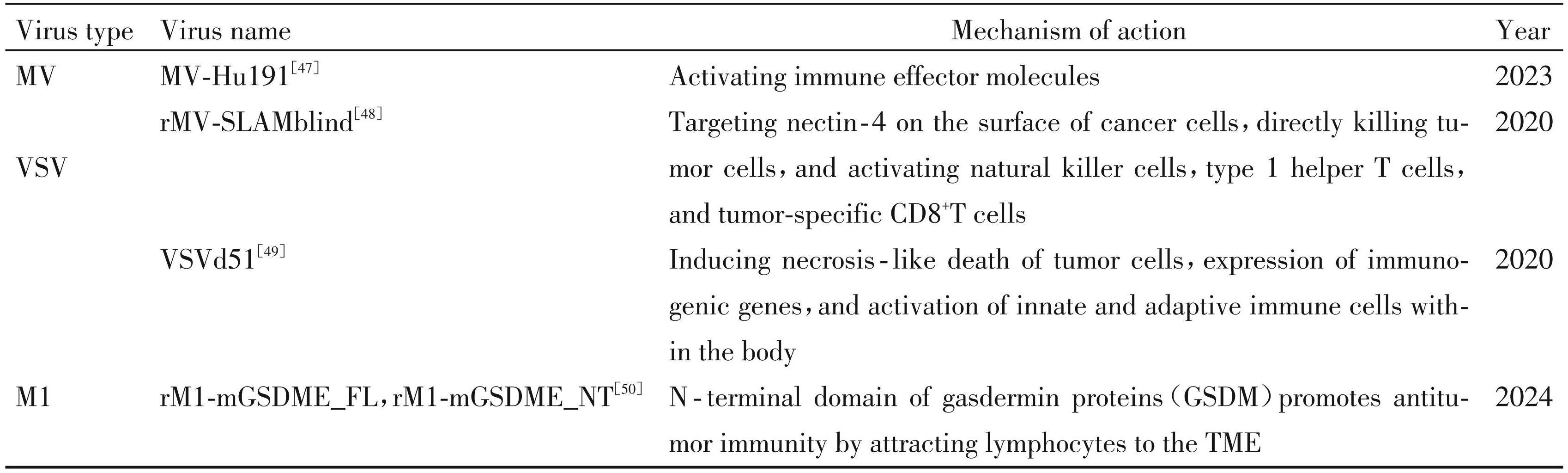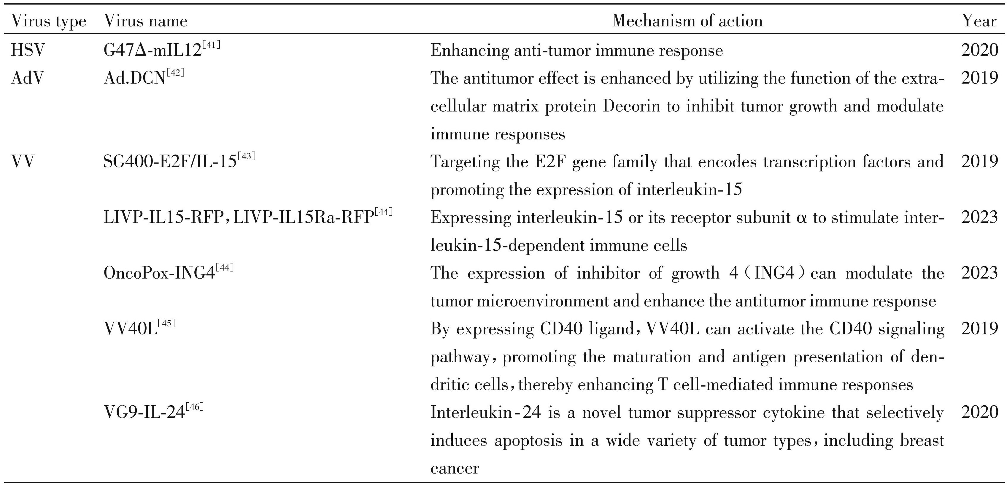 目前用于 OVT 研究的病毒包括 HSV、腺病毒 (adenovirus,AdV)、流感病毒、牛痘病毒(vaccinia virus,VV)、柯萨奇病毒、麻疹病毒(measles virus, MV)、脊髓灰质炎相关病毒、逆转录病毒、呼肠孤病毒(reovirus,RV)、副病毒 H1、VSV、新城疫病毒 (newcastle disease virus,NDV)等,它们各自独特的生物学特性,为癌症治疗提供了多样化选择[39]。研究人员综合考量安全性、给药途径、免疫反应等因素,选出最具潜力的候选药物,为开发针对BC及其他恶性肿瘤的新型疗法奠定了基础[37]。表2展示了近5年应用于BC研究的部分OV类型及其代表。