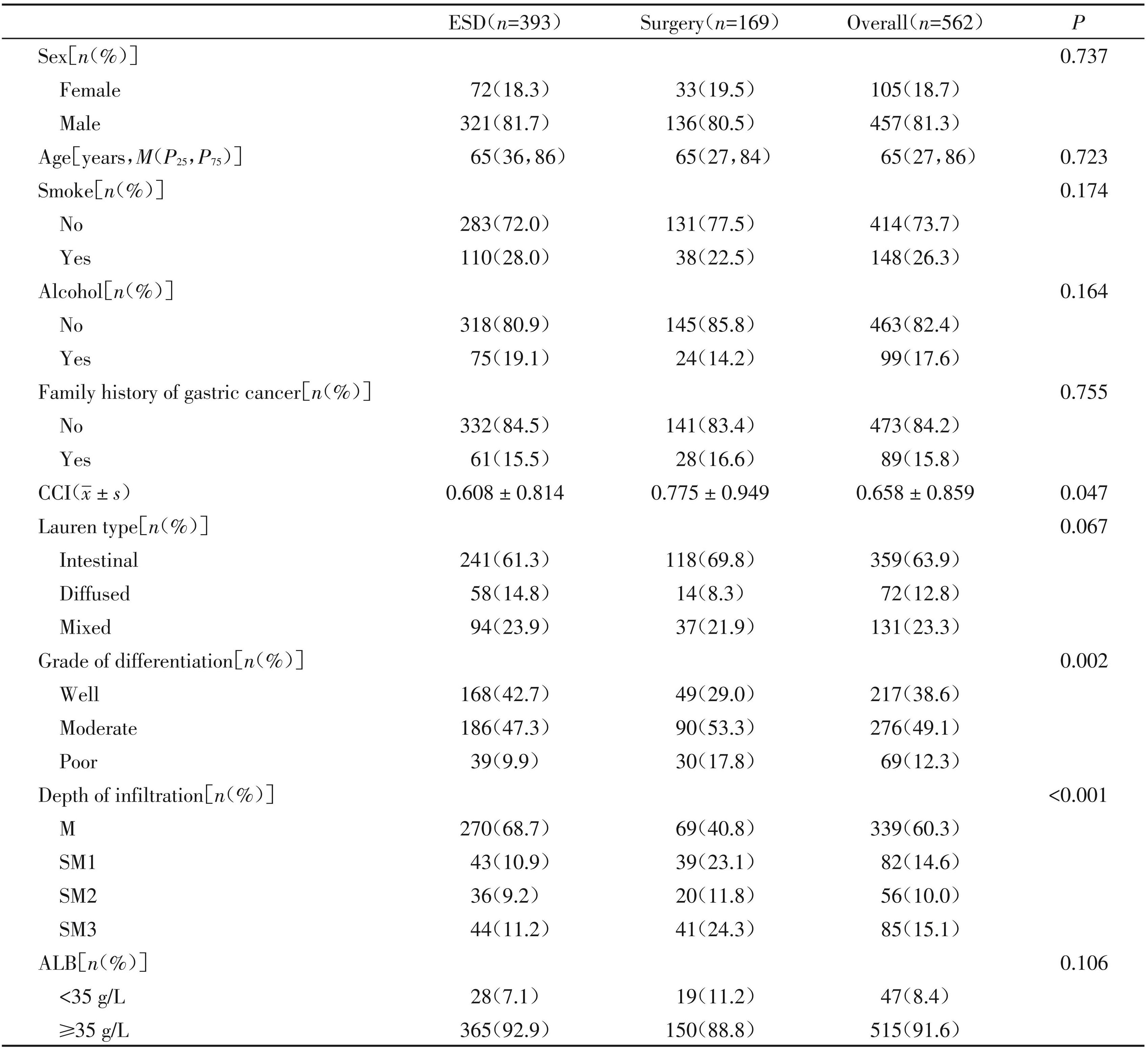 本研究纳入562例早期SiewertⅡ型AEGJ患者,其中 ESD 组 393 例,手术组 169 例。基线特征分析结果显示,两组性别(P=0.737)、年龄(P=0.723)、吸烟率(P=0.174)及饮酒率(P=0.164)等人口学参数均差异无统计学意义(表1)。然而,手术组 CCI 高于 ESD 组,差异有统计学意义(0.775 vs. 0.608,P= 0.047)。病理学分析发现,Lauren 分型分布中肠型占主导(ESD 组 61.3%),且 ESD 组高分化肿瘤比例高于手术组,差异有统计学意义(42.7% vs.29.0%, P=0.002)。浸润深度方面,ESD组黏膜层病变占比多于手术组,差异有统计学意义(68.7% vs.40.8%, P<0.001)。