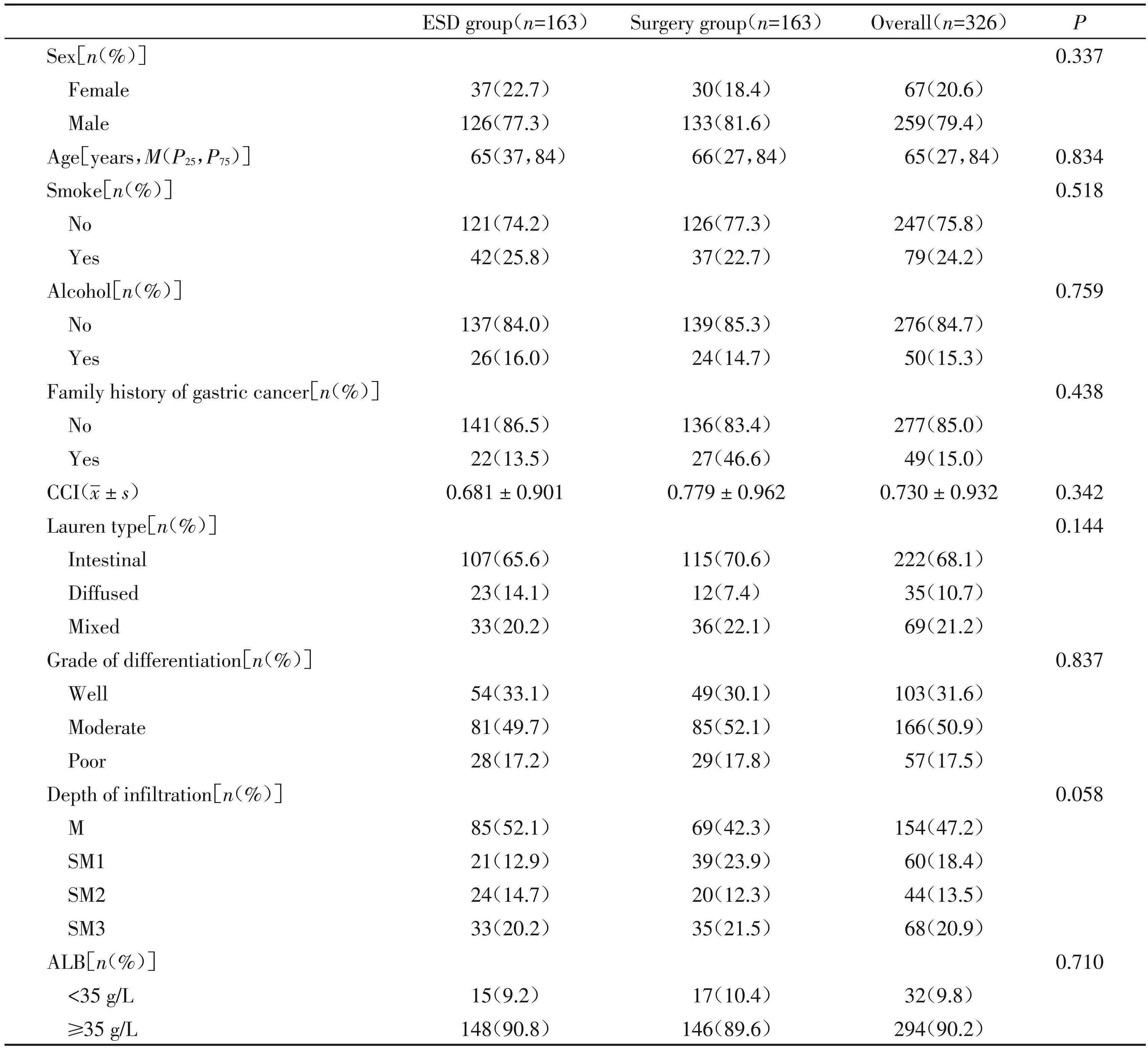 考虑到手术组和ESD组在CCI、分化程度、浸润深度上存在统计学差异,通过调整这些混杂因素进行了 PSM。两组 ESD 和外科手术组的匹配比率为 1∶1,匹配容忍度为0.01。匹配方法生成了2个平衡组,每组包含163例患者。经过PSM后,每个考察变量在手术组和 ESD 组之间差异均无统计学意义 (P >0.05)。表2展示了 PSM 后早期 SiewertⅡ型AEGJ患者的基线特征。