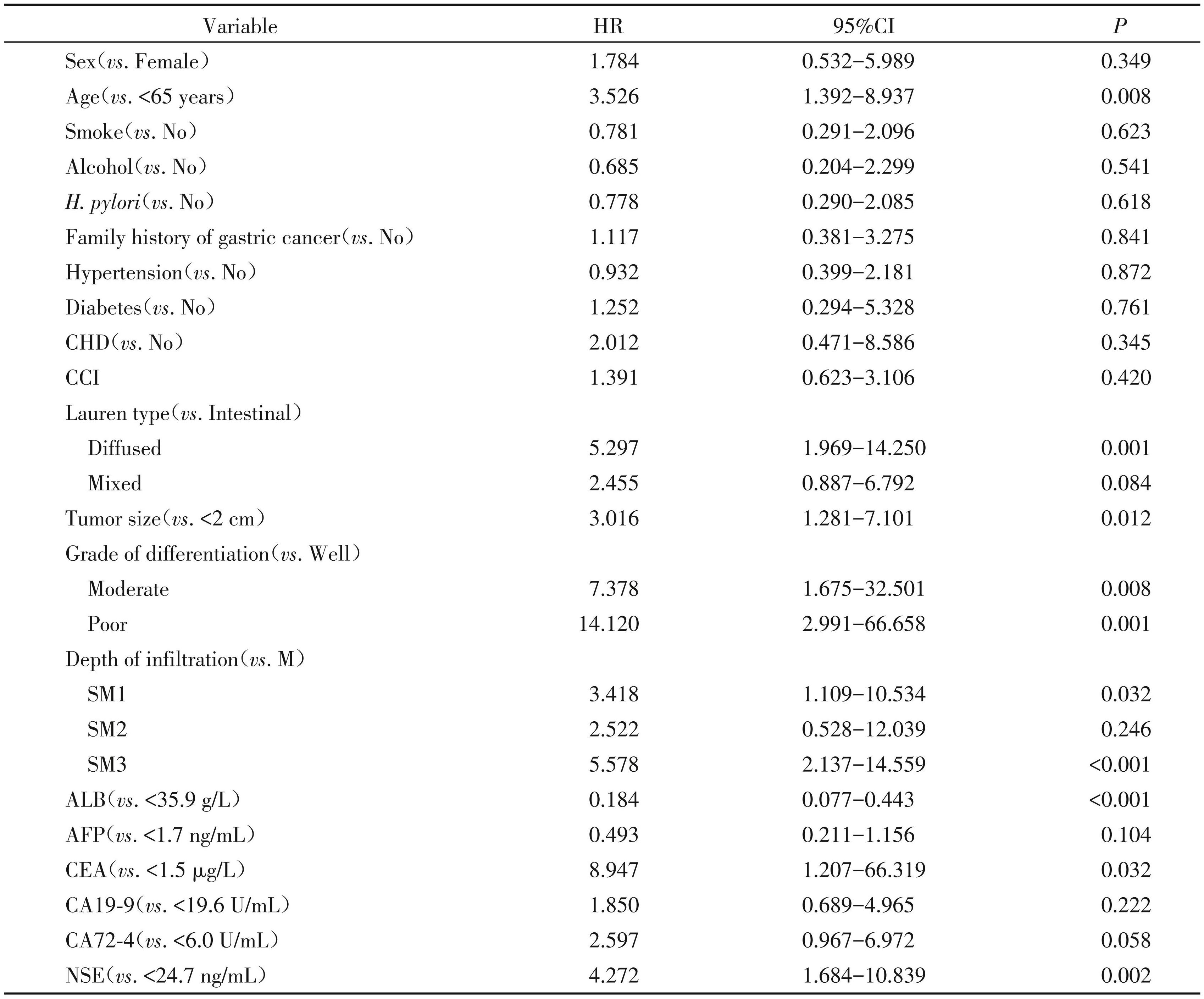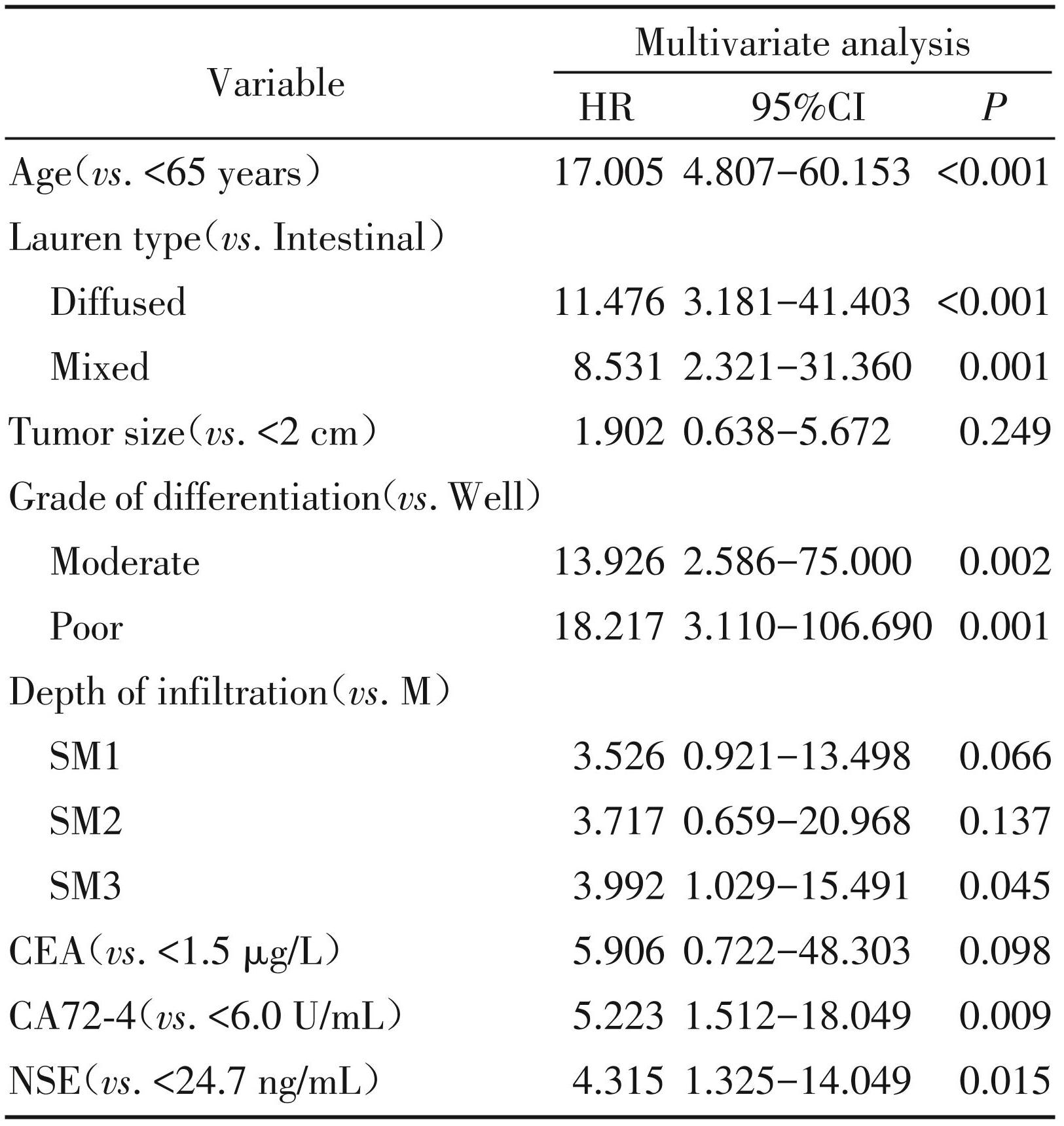 HR:Hazard ratio;CI:confidence interval;ESD:endoscopic submu⁃ cosal dissection;M:mucosal layer;SM:submucosal layer;CEA:carcino⁃ embryonic antigen;CA72⁃4:carbohydrate antigen 72⁃4;NSE:neuron ⁃ specific enolase.