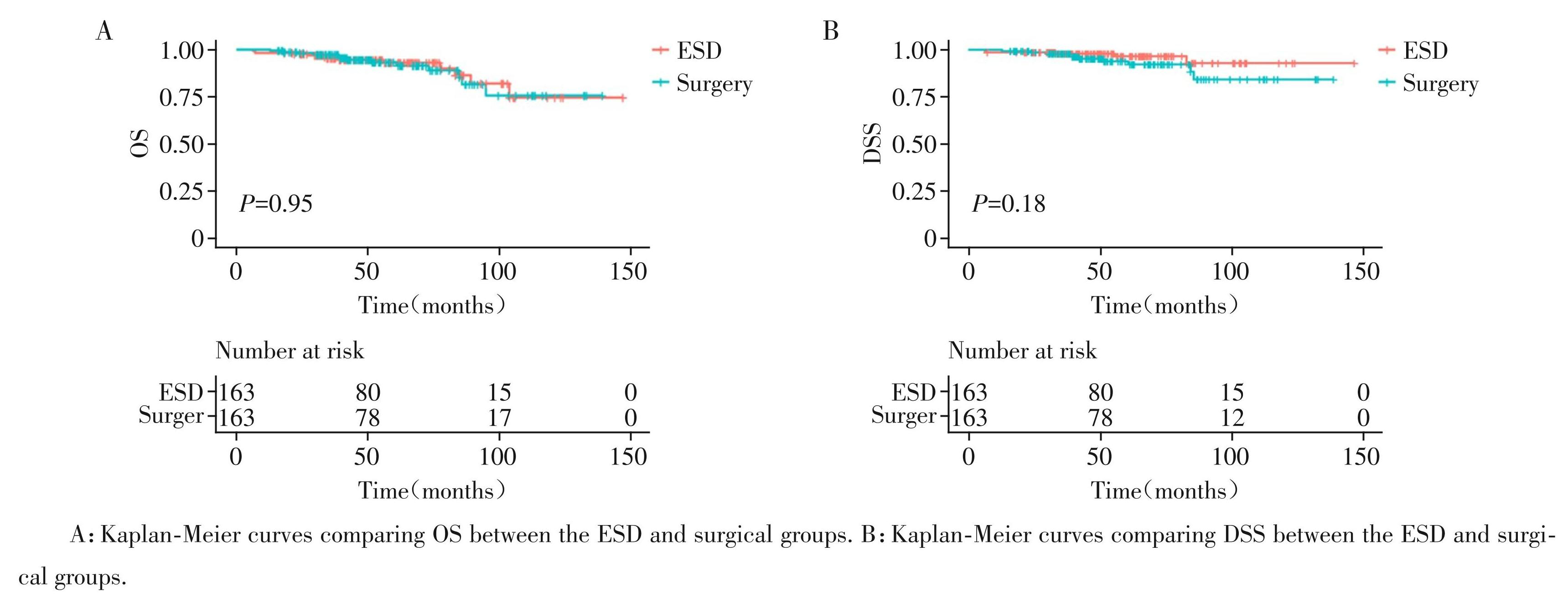 有研究表明,分化不良的肿瘤和黏膜下肿瘤浸润是患者生存时间的显著危险因素。本研究探讨了浸润深度为 SM3 的部分患者,Kaplan⁃Meier 分析显示,ESD治疗的患者与外科手术治疗的患者相比, OS 差异无统计学意义(P=0.72,图2A),DSS 差异也无统计学意义(P=0.97,图2B)。