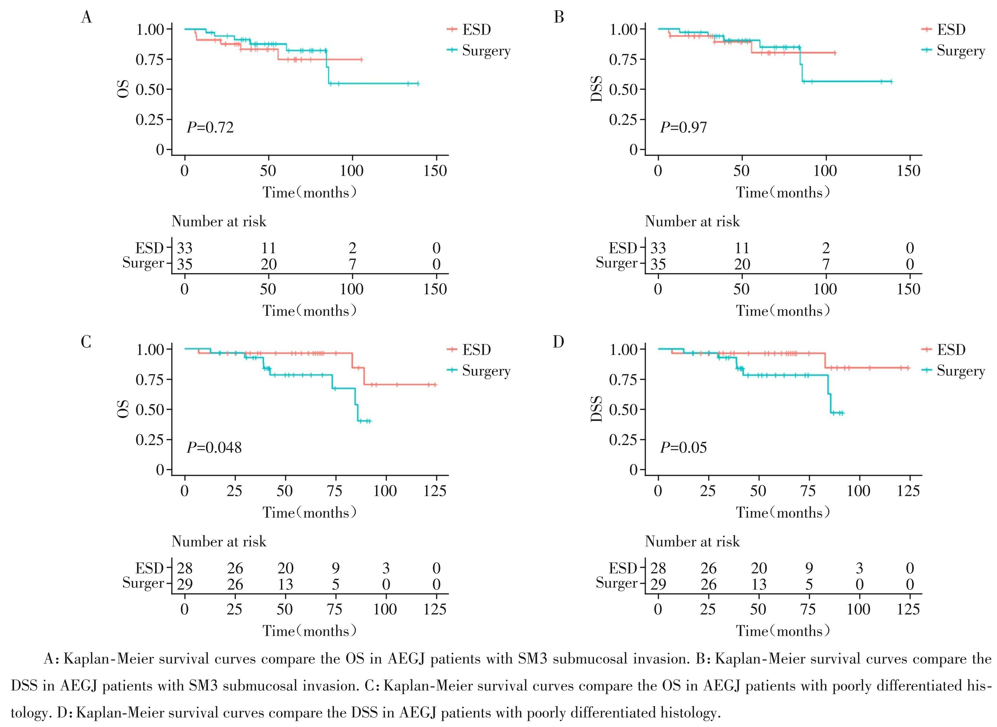 针对肿瘤的分化程度,进一步探讨了低分化的早期SiewertⅡ型AEGJ患者ESD和外科手术的长期生存情况,Kaplan⁃Meier 分析显示 ESD 治疗的患者和外科手术治疗的患者相比,ESD 组有更好的 OS (P=0.048,图2C)和DSS(P=0.05,图2D)。