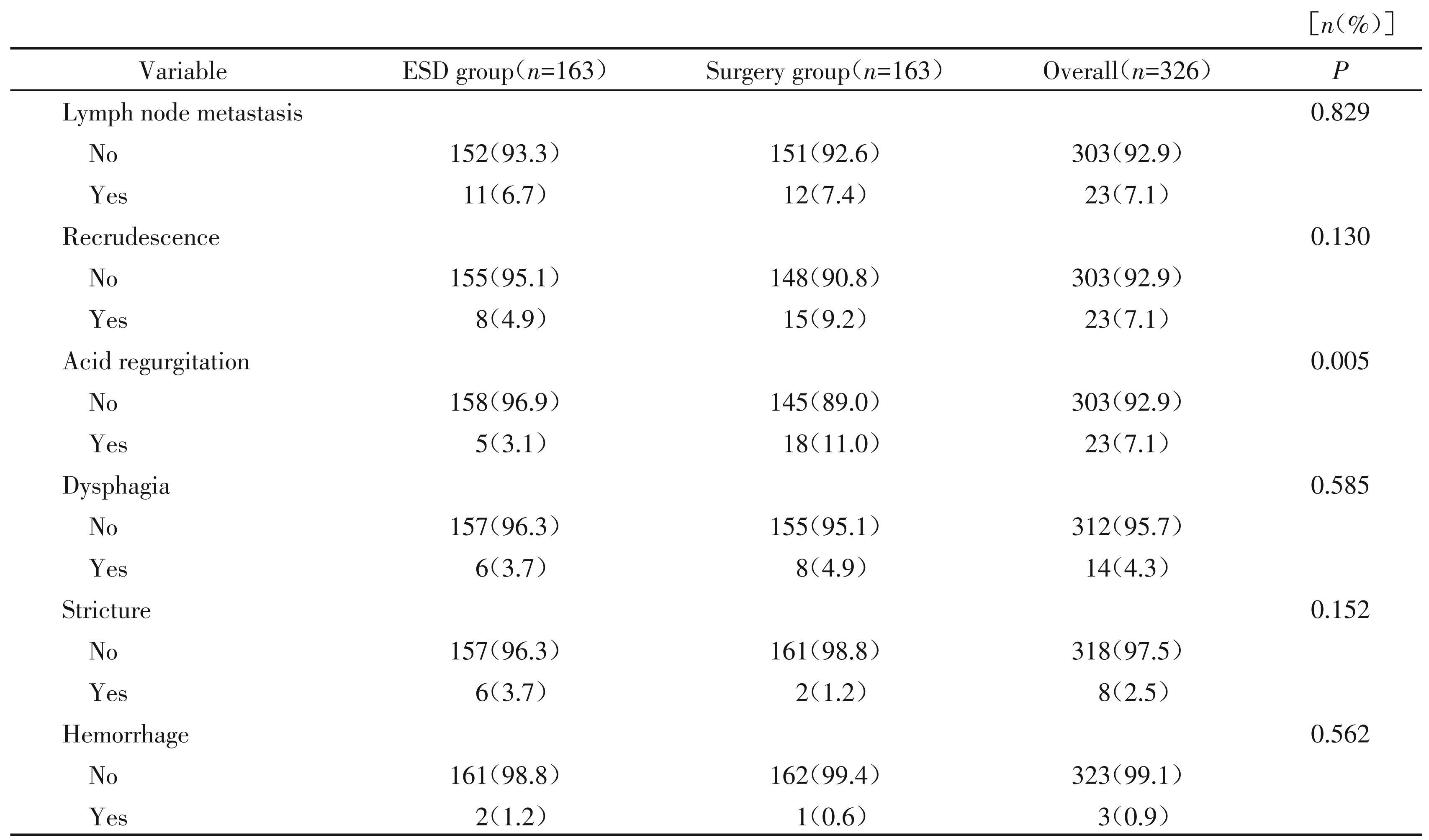在PSM后,ESD组与手术组各纳入163例,总样本量326例。治疗相关不良事件的对比分析显示,两组淋巴结转移率(6.7% vs.7.4%,P=0.829)、局部复发率(4.9% vs.9.2%,P=0.130)及术后狭窄率 (3.7% vs.1.2%,P=0.152)差异均无统计学意义。