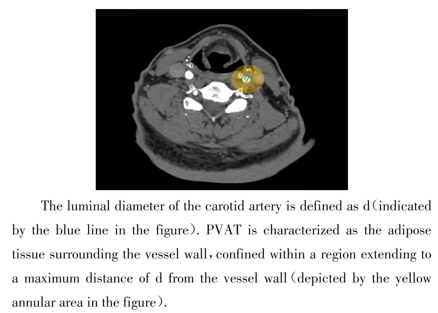 PVAT 是与血管外膜紧密相连的脂肪组织,与血管外膜没有解剖间隙,与邻近颈动脉血管壁之间形成一个相对独立的结构单元,存在于除脑血管外的大部分血管周围[9]。Antonopoulos 等[10] 进一步将 PVAT定义为与血管管腔直径相等距离内的脂肪组织,这一定义适用于管腔直径<2 cm的任何动脉,而对于管腔直径>2 cm的动脉,则将PVAT按照惯例定义为血管外壁周围2 cm范围内的脂肪组织[11]。颈动脉管腔直径一般<8 mm,由此而来颈动脉PVAT可定义为颈动脉周围与管腔直径相等距离内的脂肪组织(图1)。