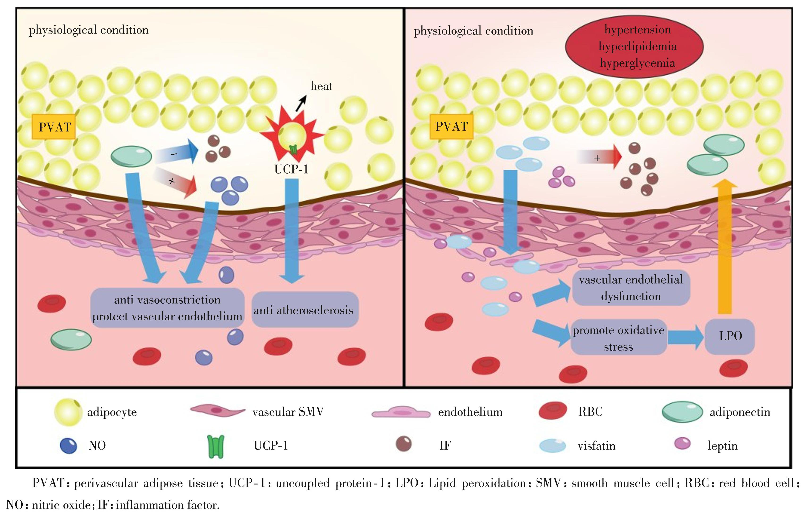 常规的脂肪组织包括白色脂肪、棕色脂肪和米色脂肪,而人类的PVAT作为一种特殊的脂肪组织,兼具白色脂肪和棕色脂肪的组织学特征,更具有独特的细胞组成和功能特征[12]。PVAT 的脂肪细胞体积更小,分化程度更低,能够分泌更多的细胞因子[13]。因此,PVAT 在功能上也与常规脂肪组织不同,PVAT 不仅能够起到基本的支撑动脉管壁结构的作用,还具备特殊的内分泌及旁分泌功能,可释放一系列生物活性分子,帮助调节血管功能,在炎症反应及代谢过程中发挥重要作用[14]。PVAT的分泌功能对血管稳态的调节具有“两面性”(图2)。在生理状态下,PVAT 主要分泌一系列血管保护性因子如一氧化氮、脂联素等,发挥抗血管收缩、抗炎、抗氧化的保护作用[15]。棕色脂肪中特异性表达的解偶联蛋白⁃ 1(uncoupled protein ⁃ 1,UCP ⁃ 1)在 PVAT中也可以表达,UCP⁃1产热消耗脂肪细胞,起到抗动脉粥样硬化作用,并且UCP⁃1还会减少活性氧(reactive oxygen species,ROS)的产生,起到抗氧化应激的效果[16]。而在病理条件下,高血压、高血脂、高血糖等会刺激PVAT,使之分泌功能失衡,内脂素[17]、瘦素[18] 等炎症因子和趋化因子比例增加,反而加剧炎症反应,诱导动脉粥样硬化发生发展。 PVAT除了通过分泌各种生物活性分子作用于血管壁“由外向内”地影响血管功能以外,多项研究已指出PVAT与邻近血管壁之间还存在“由内向外”的信号传递,即PVAT接受来自于血管的旁分泌信号,然后PVAT会改变自身的形态和脂肪因子的分泌以做出回应,从而将旁分泌作用重新施加到血管壁上,例如在病理状态下,血管壁分泌脂质过氧化产物扩散到周围的 PVAT,激活过氧化物酶体增殖物激活受体信号转导通路,进而引发脂联素分泌水平上调,发挥抗炎、抗氧化作用[19]。总之,PVAT 与其邻近血管壁之间是以复杂的“双向信号通信”的方式相互影响的。