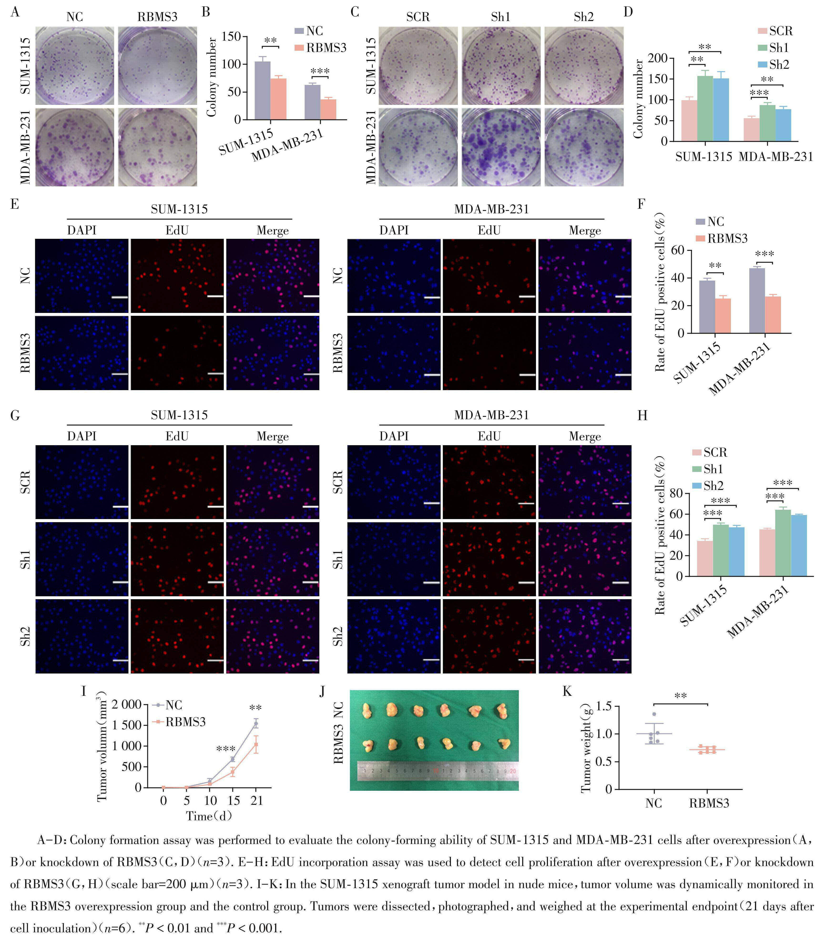 集落形成实验显示:RBMS3 过表达显著抑制 SUM⁃1315和MDA⁃MB⁃231细胞的集落形成能力(图1A、B),而RBMS3敲降则显著促进集落形成(图1C、 D)。EdU掺入实验结果与之一致,RBMS3过表达组 EdU阳性细胞率显著低于对照组(图1E、F),RBMS3敲降组则显著升高(图1G、H)。流式细胞术分析显示:RBMS3 过表达可诱导 MDA ⁃MB ⁃ 231 和 SUM ⁃ 1315细胞G0/G1期阻滞(图2A~D)并显著提高细胞凋亡率(图2E~H)。裸鼠异种移植瘤模型结果显示: RBMS3 过表达组的肿瘤生长速度显著慢于对照组 (图1I),且肿瘤体积(图1J)与质量(图1K)均显著降低。以上结果表明,RBMS3在体外和体内均能抑制乳腺癌细胞增殖。