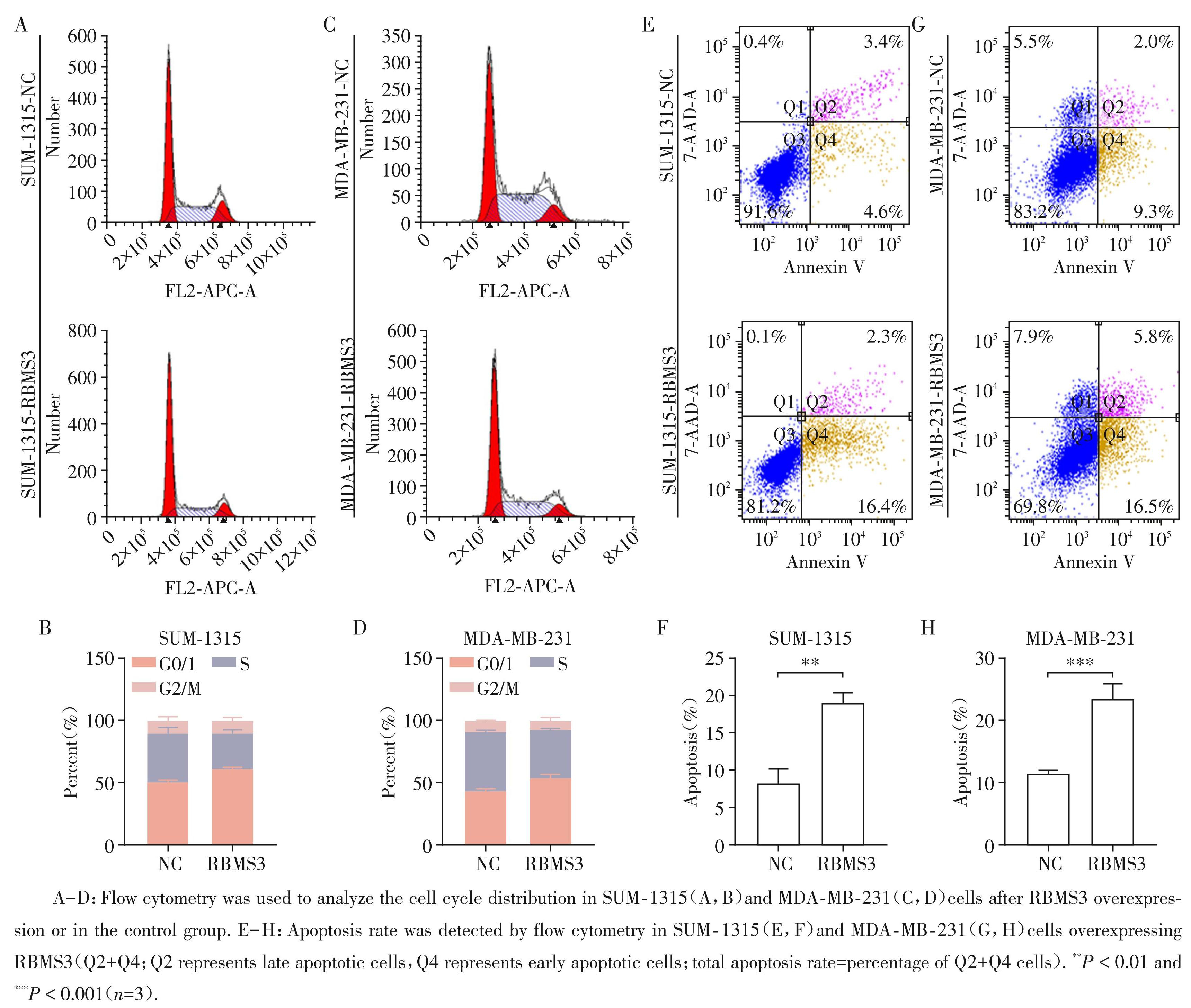 图2过表达RBMS3促进乳腺癌细胞周期阻滞和凋亡