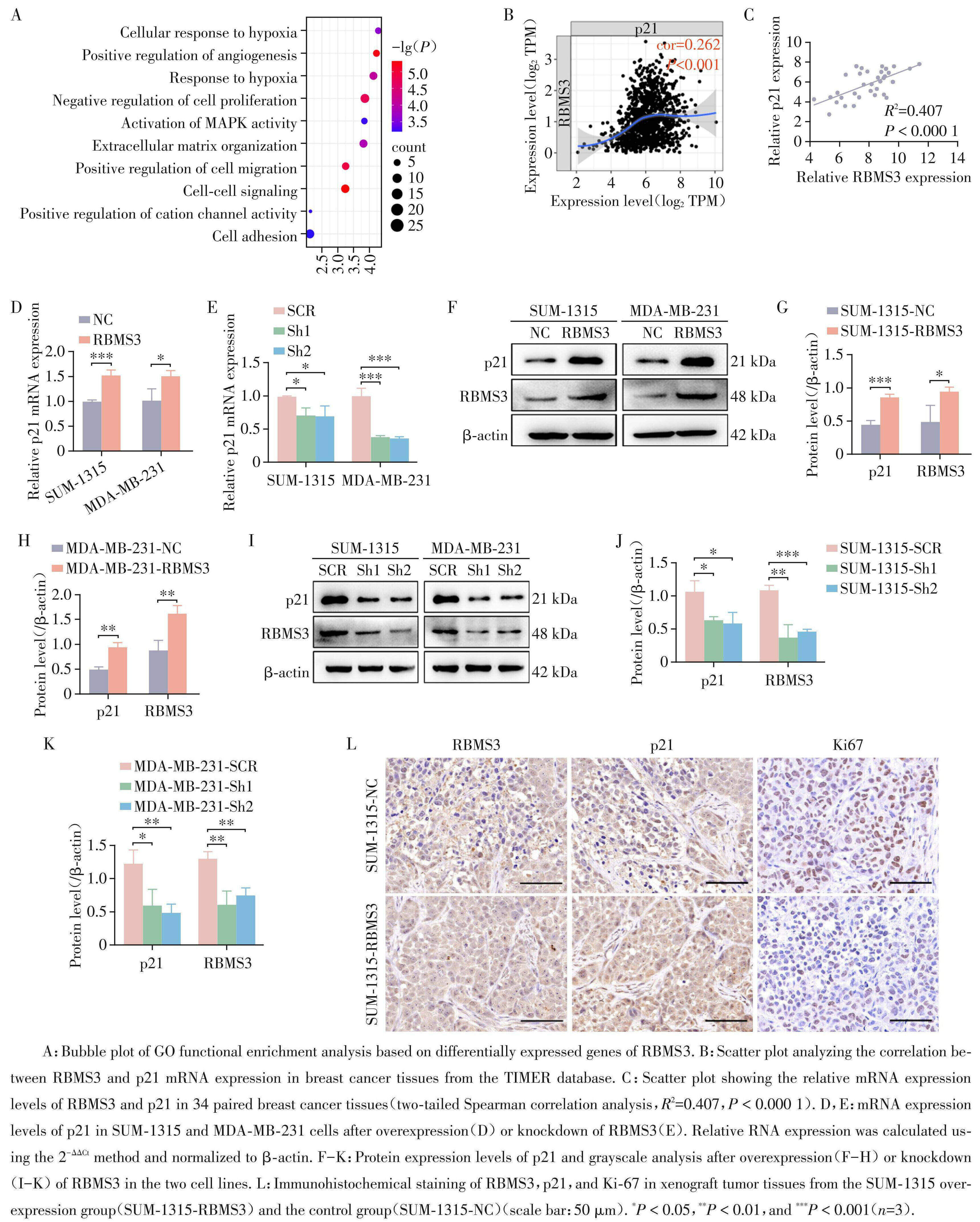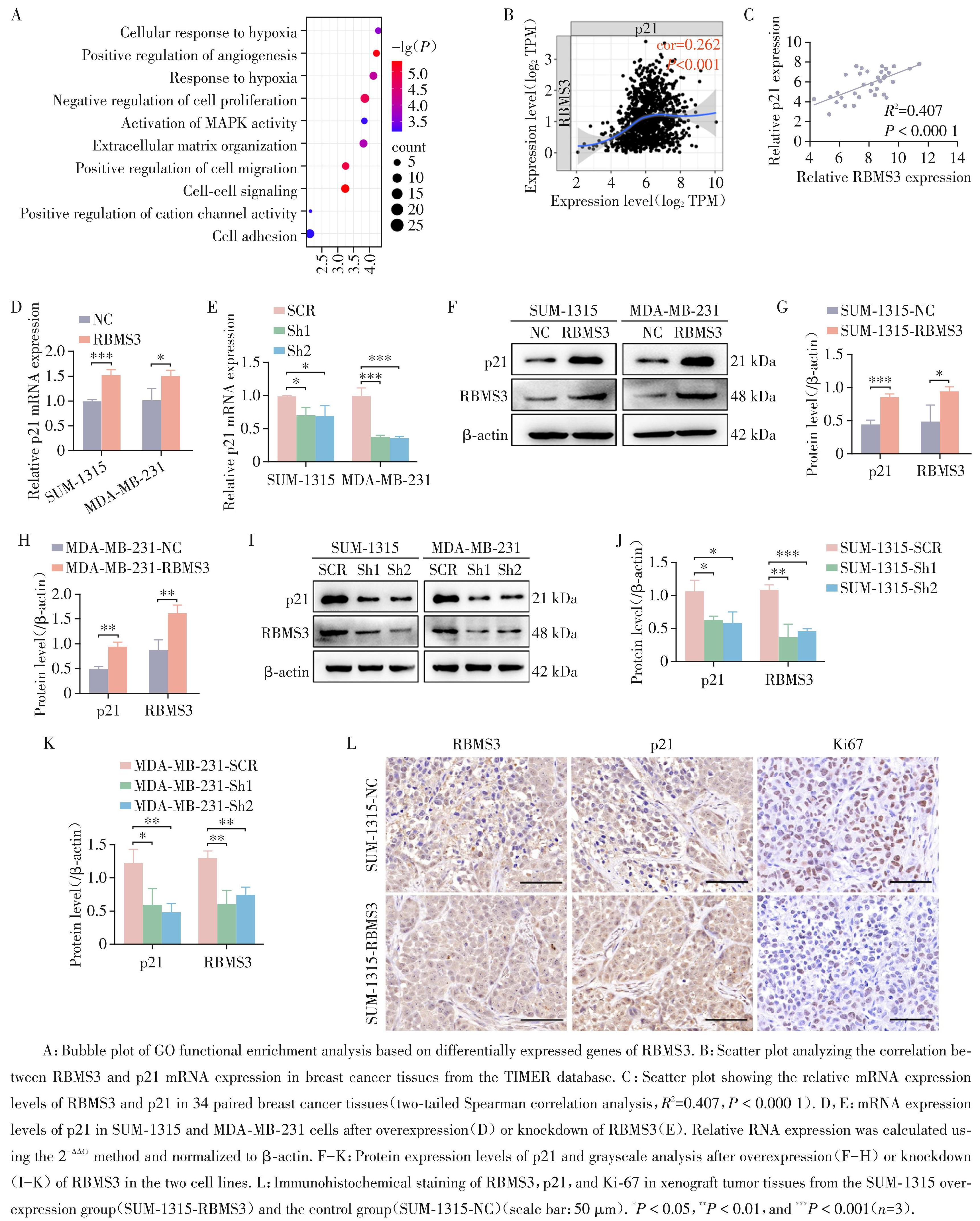 基于前期转录组测序数据的GO功能富集分析显示,RBMS3 表达与细胞增殖负向调控密切相关 (图3A),与 RBMS3 诱导细胞周期阻滞的实验结果一致。在潜在靶基因中,细胞周期调控蛋白p21引起关注。TIMER 数据库分析显示,RBMS3 与 p21 mRNA表达呈正相关(图3B);使用qRT⁃PCR检测收集的 34 例乳腺癌组织中 RBMS3 与 p21 的 mRNA 表达水平,进一步证实RBMS3与p21 mRNA表达呈显著正相关(图3C)。在SUM⁃1315和MDA⁃MB⁃231细胞中,RBMS3过表达显著上调p21的mRNA(图3D) 与蛋白水平(图3F~H),而RBMS3敲降则显著下调 p21的mRNA(图3E)与蛋白水平(图3I~K)。移植瘤组织 IHC 染色显示,相比对照组,RBMS3 过表达组 Ki67阳性率降低,p21阳性率升高(图3L)。