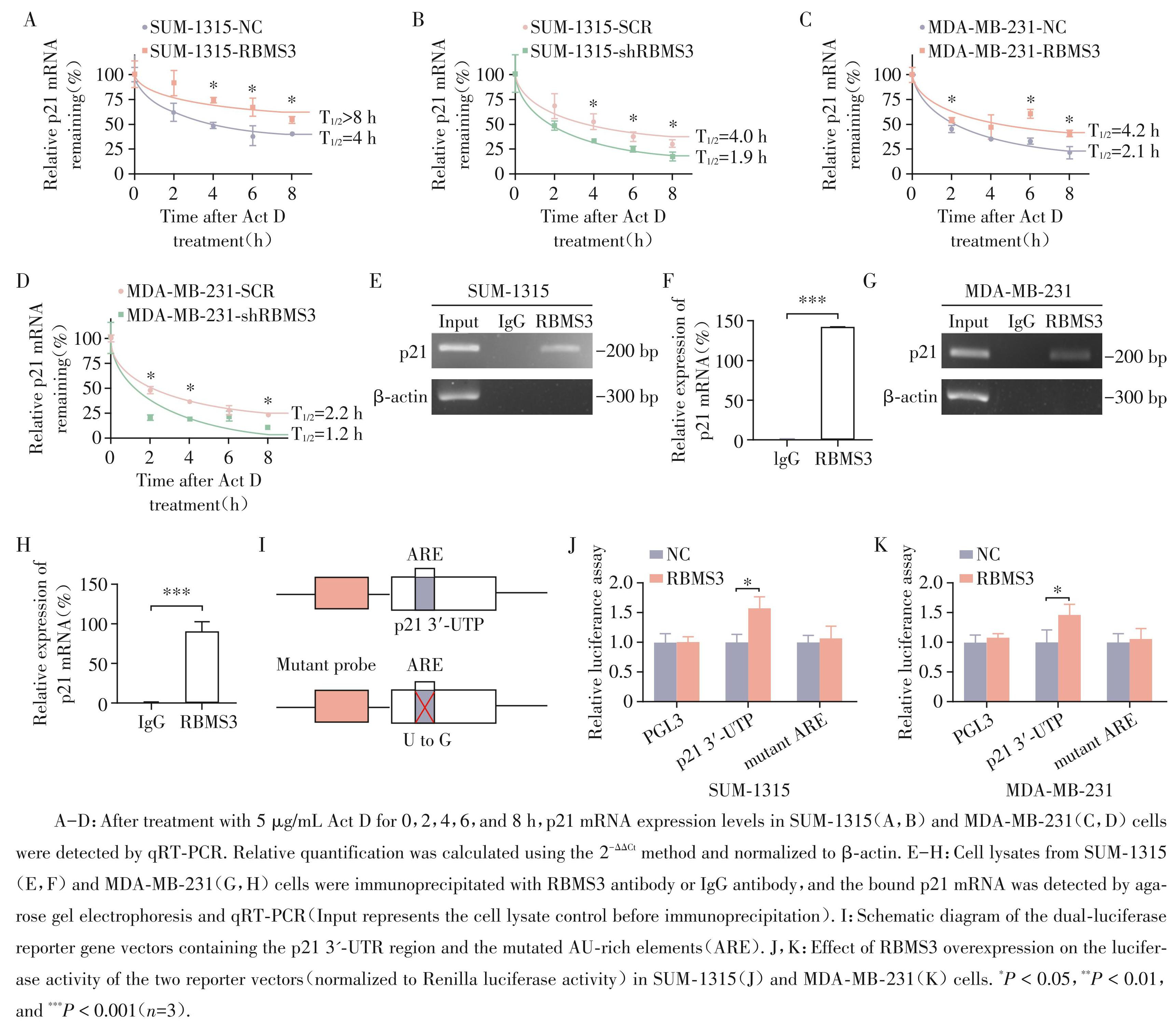 RNA 稳定性实验显示:在 SUM⁃1315 细胞中, RBMS3 过表达将 p21 mRNA 的半衰期(原 4 h)延长(>8 h)(图4A),RBMS3敲降则将p21 mRNA的半衰期从 4 h缩短至1.9 h(图4B);在MDA⁃MB⁃231细胞中,RBMS3过表达将p21 mRNA 的半衰期从2.1 h 延长至4.2 h(图4C),RBMS3敲降将p21 mRNA的半衰期从2.2 h缩短至1.2 h(图4D),提示RBMS3通过增强p21 mRNA稳定性上调其表达。