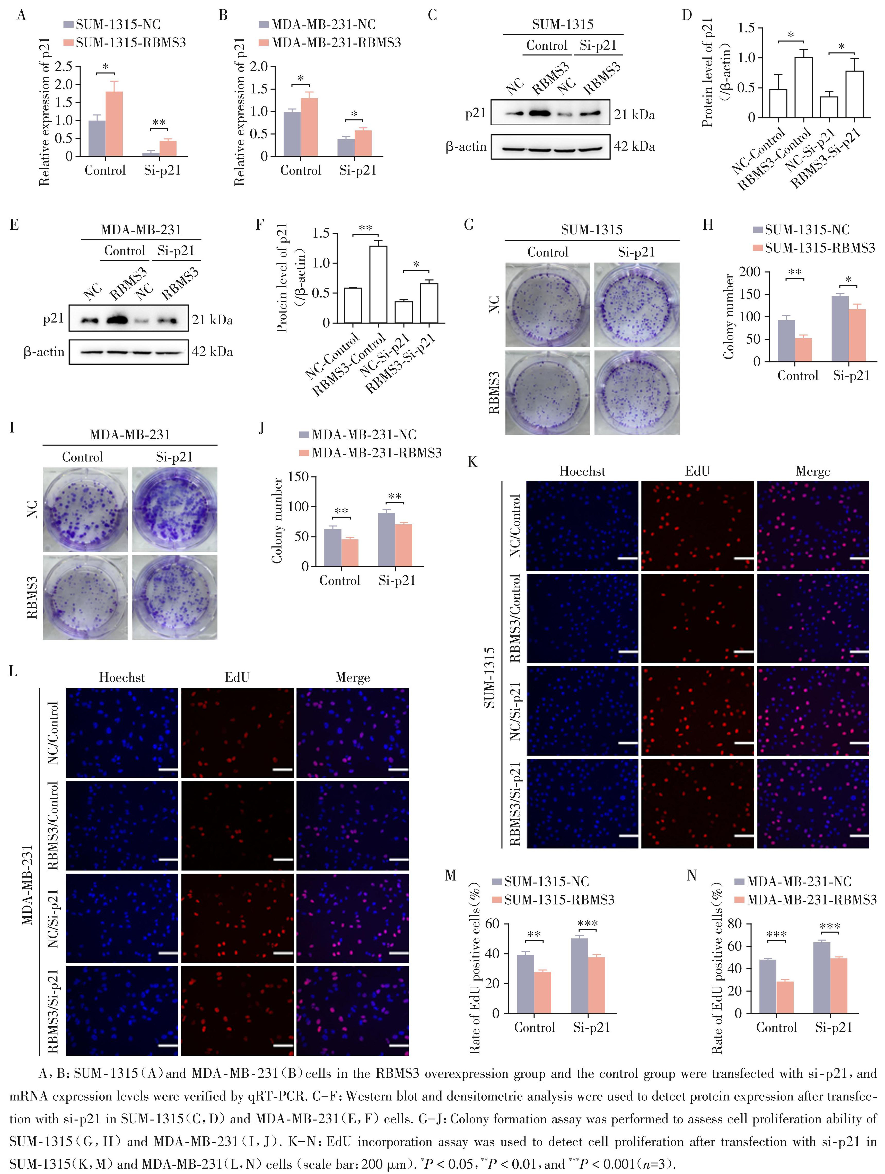 为验证RBMS3诱导的乳腺癌细胞增殖抑制是否依赖于 p21,将敲低 p21 的 siRNA(Si⁃p21)或对照 siRNA(Ctrl)转染至 RBMS3 过表达细胞。qRT⁃PCR 与WB检测显示,Si⁃p21可有效敲低p21的RNA(图5A、B)与蛋白水平(图5C~F)。集落形成实验显示,敲低p21可部分挽救RBMS3过表达引起的细胞增殖抑制(图5G~J);EdU实验结果与之一致(图5K~N)。表明 RBMS3 通过上调 p21 抑制乳腺癌细胞增殖。