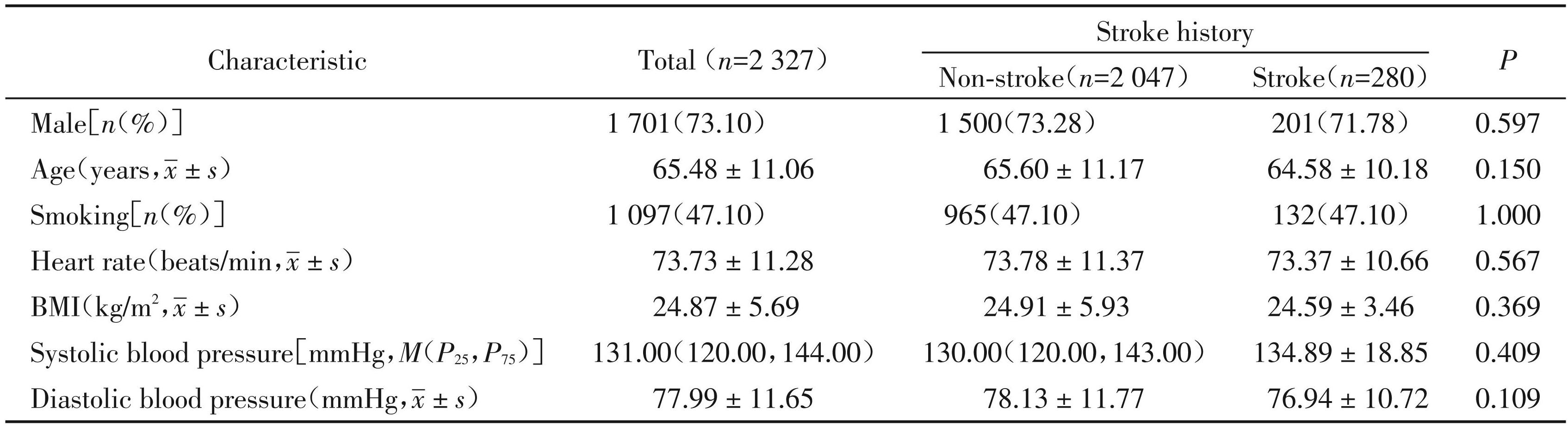 所有数据的统计分析均使用 SAS 9.4 及 SPSS20.0进行。符合正态分布的计量资料以均数± 标准差()表示,并采用独立样本t检验进行组间比较;不符合正态分布的计量资料用中位数(四分位数)[M(P25,P75)]表示,并使用Wilcoxon秩和检验进行组间比较;计数资料以频数和百分比表示并使用χ2 检验进行组间比较。对年龄、性别及BMI等重要协变量进行调整后,通过多因素Logistic回归分析评估脑卒中既往史与冠心病患者临床表现之间的关系。P <0.05为差异有统计学意义。